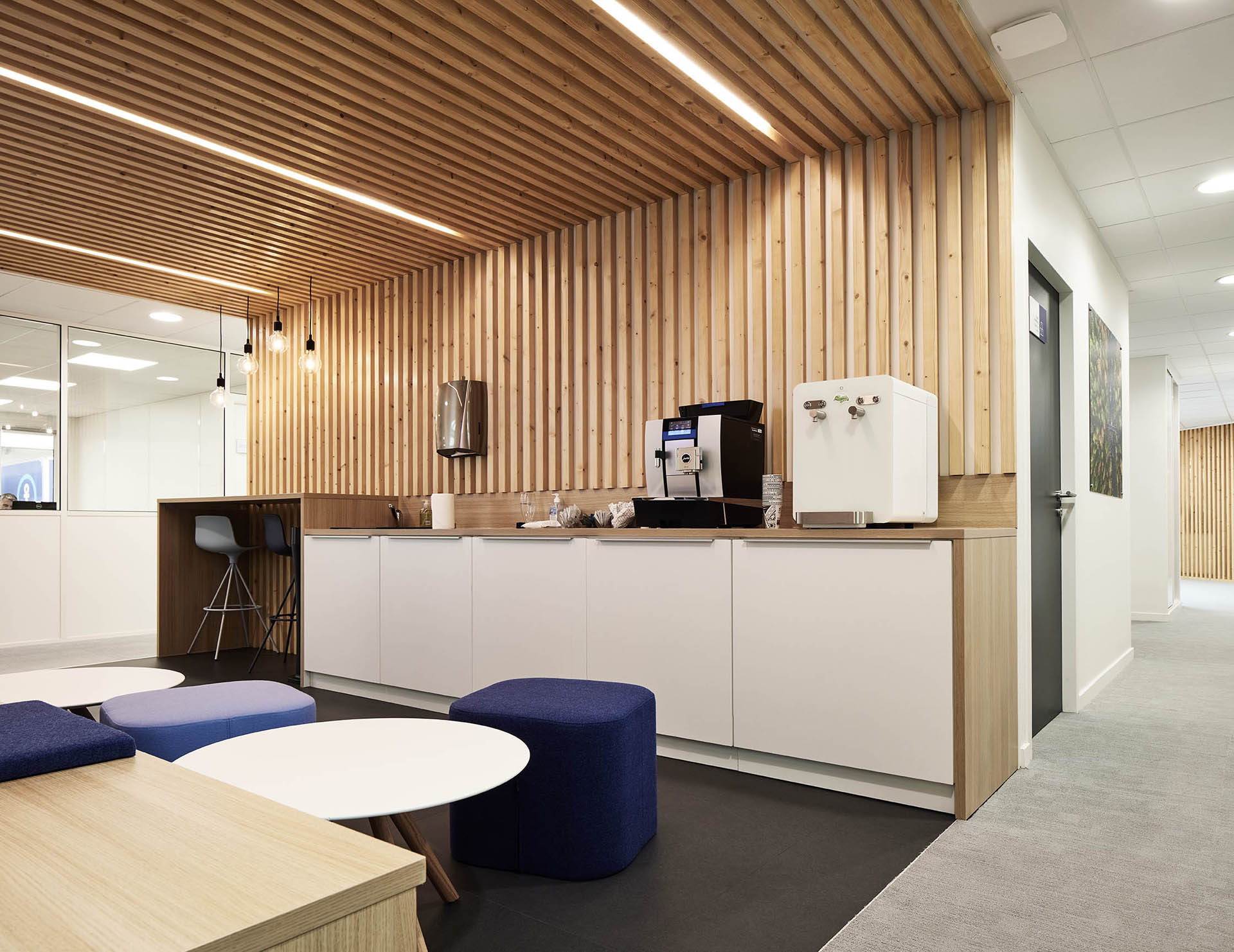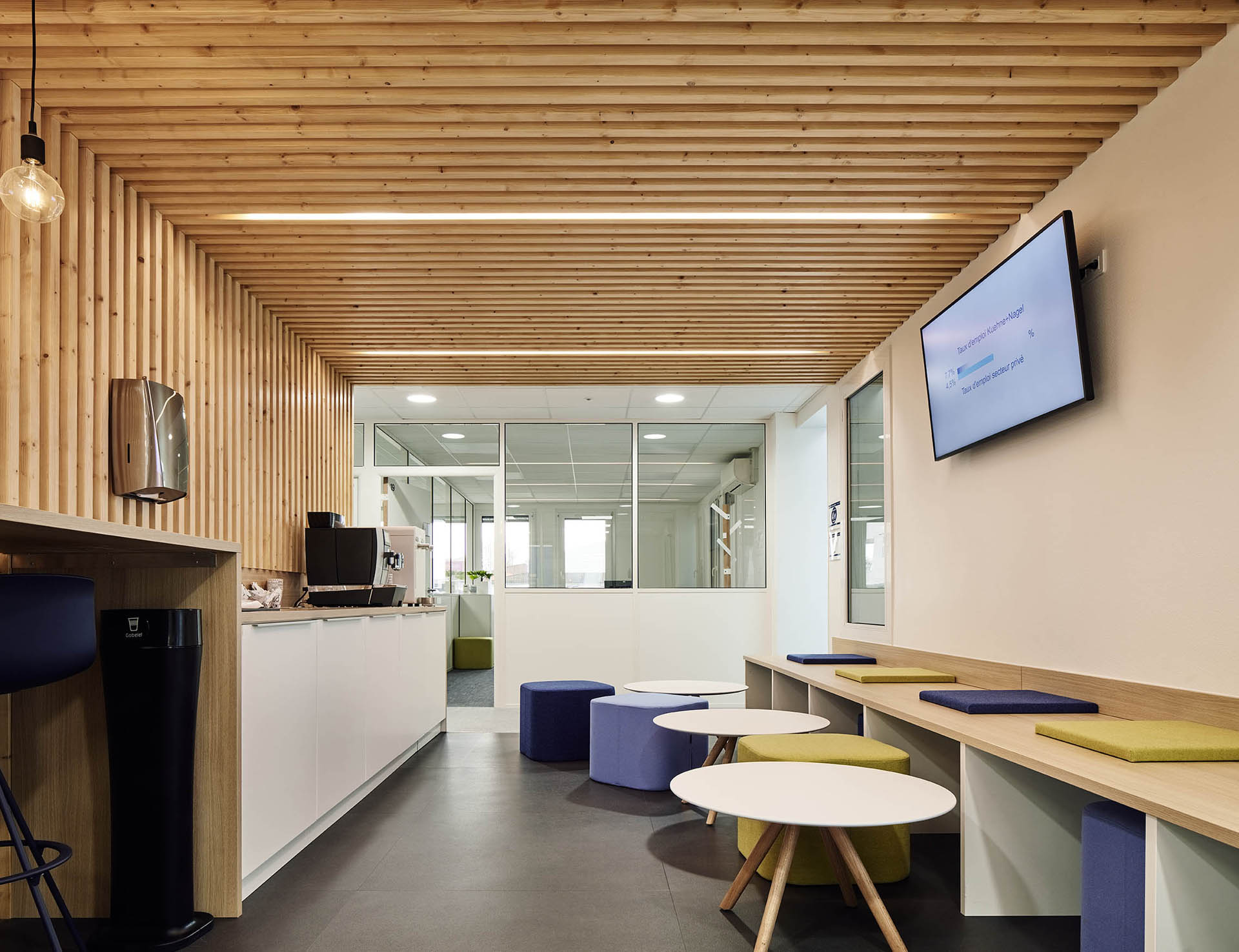 Toutefois, outre ces travaux de finition, il a été proposé de restructurer certains espaces particuliers, afin de créer des lieux d’usages partagés attrayants : des larges espaces détente / café ont été percés dans les zones centrales du bâtiment. Ces zones proposent des vastes plans de travail, chaises bar, et des coins table basse / coussins, qui apportent, dans un écrin en bois, une véritable qualité d’usage aux collaborateurs.