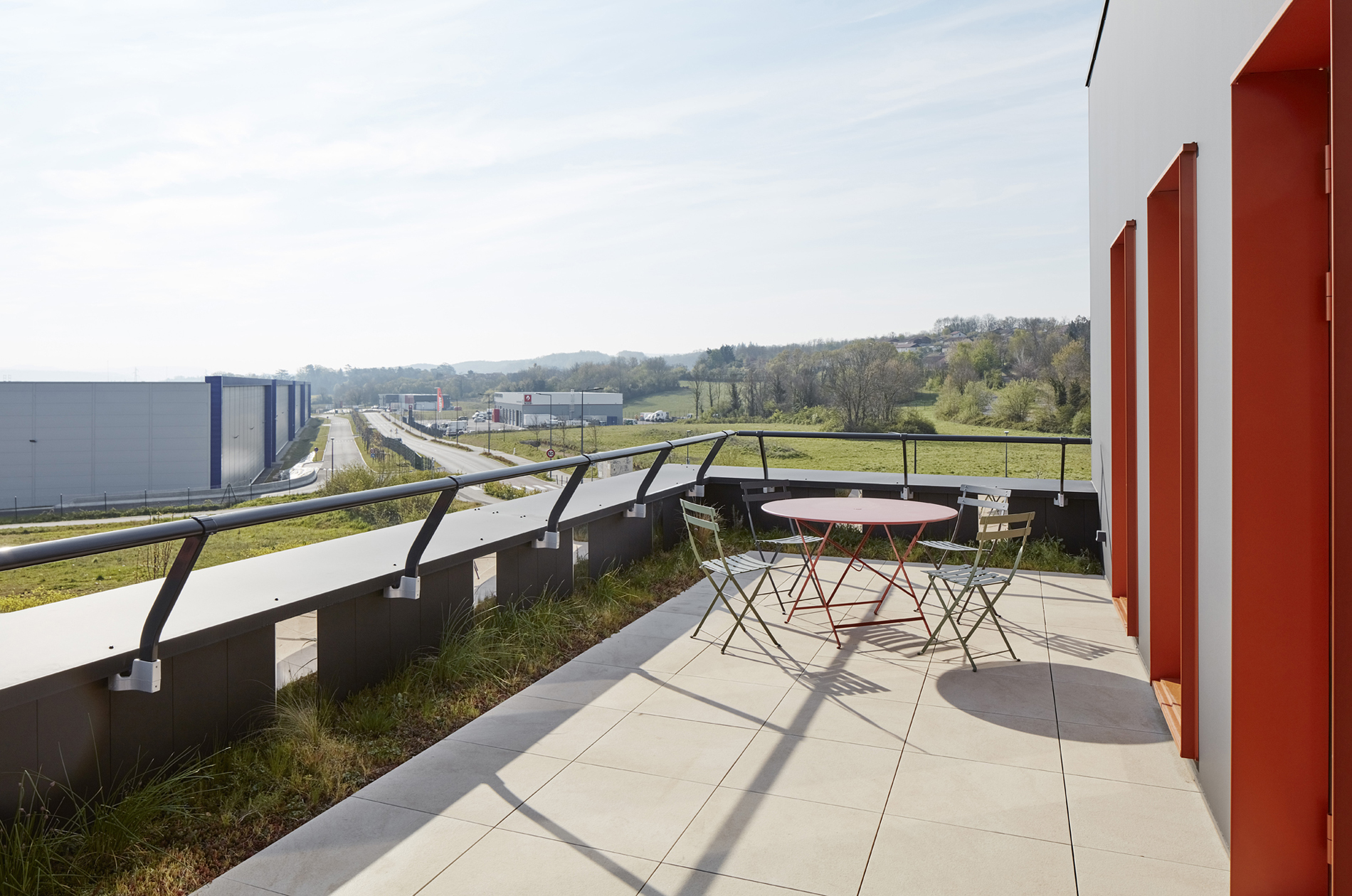 Sur les terrasses extérieures, les ateliers 4+ ont mêlé dallettes sur plots et végétalisation, avec un habillage miroir des contre-bardages, ce qui donne une impression de transparence.