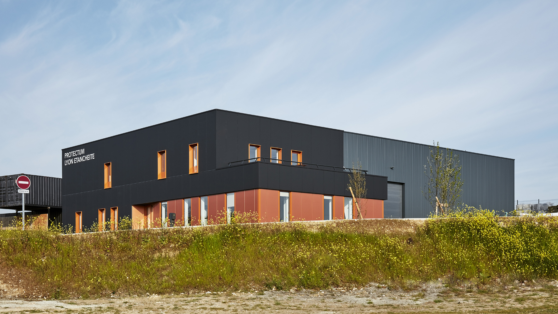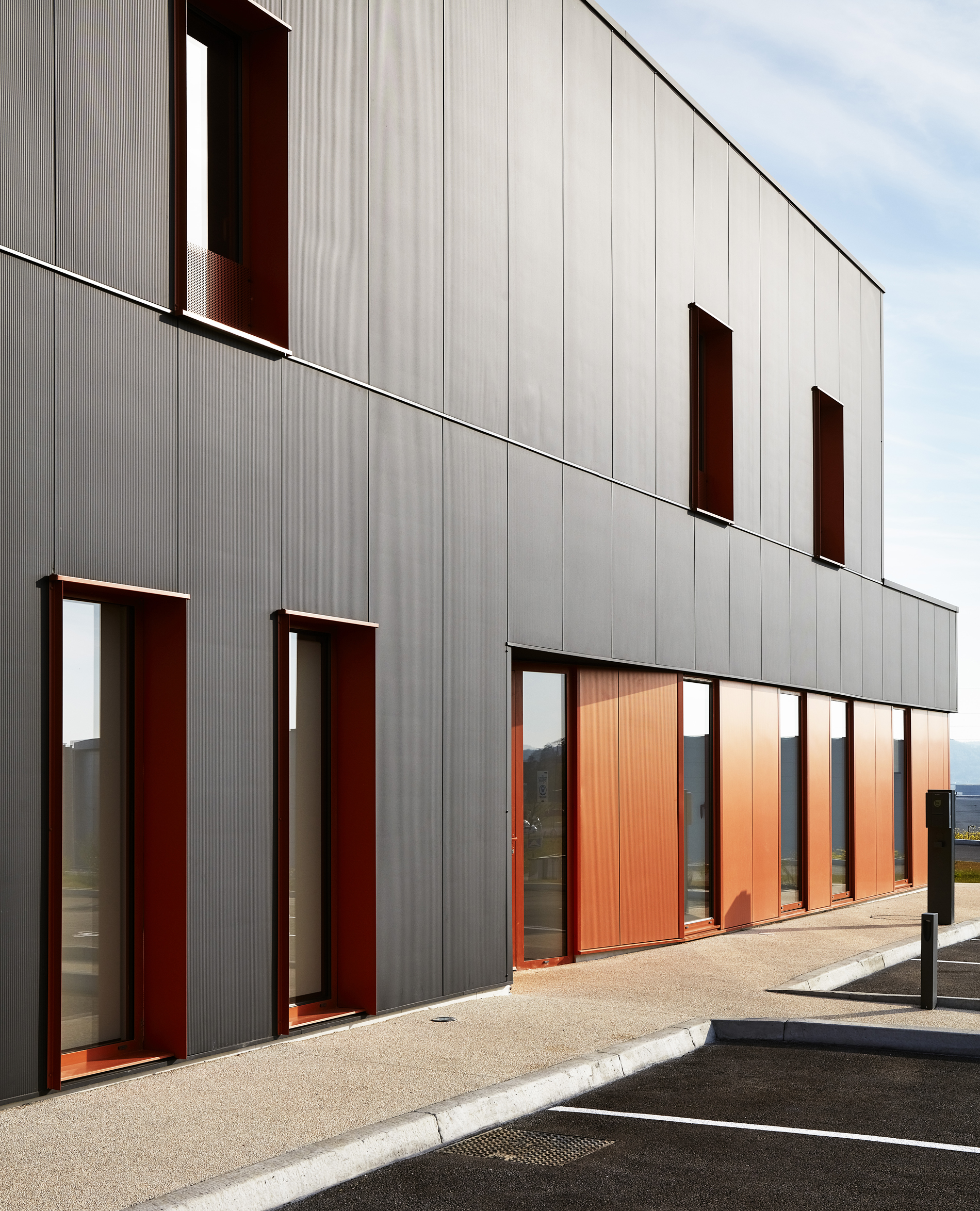Une attention particulière a été portée à l’architecture du bâtiment, vitrine pour l’entreprise. Des bardages soignés, contrastés ont été choisis pour apporter une touche résolument contemporaine aux volumes, volontairement simples.