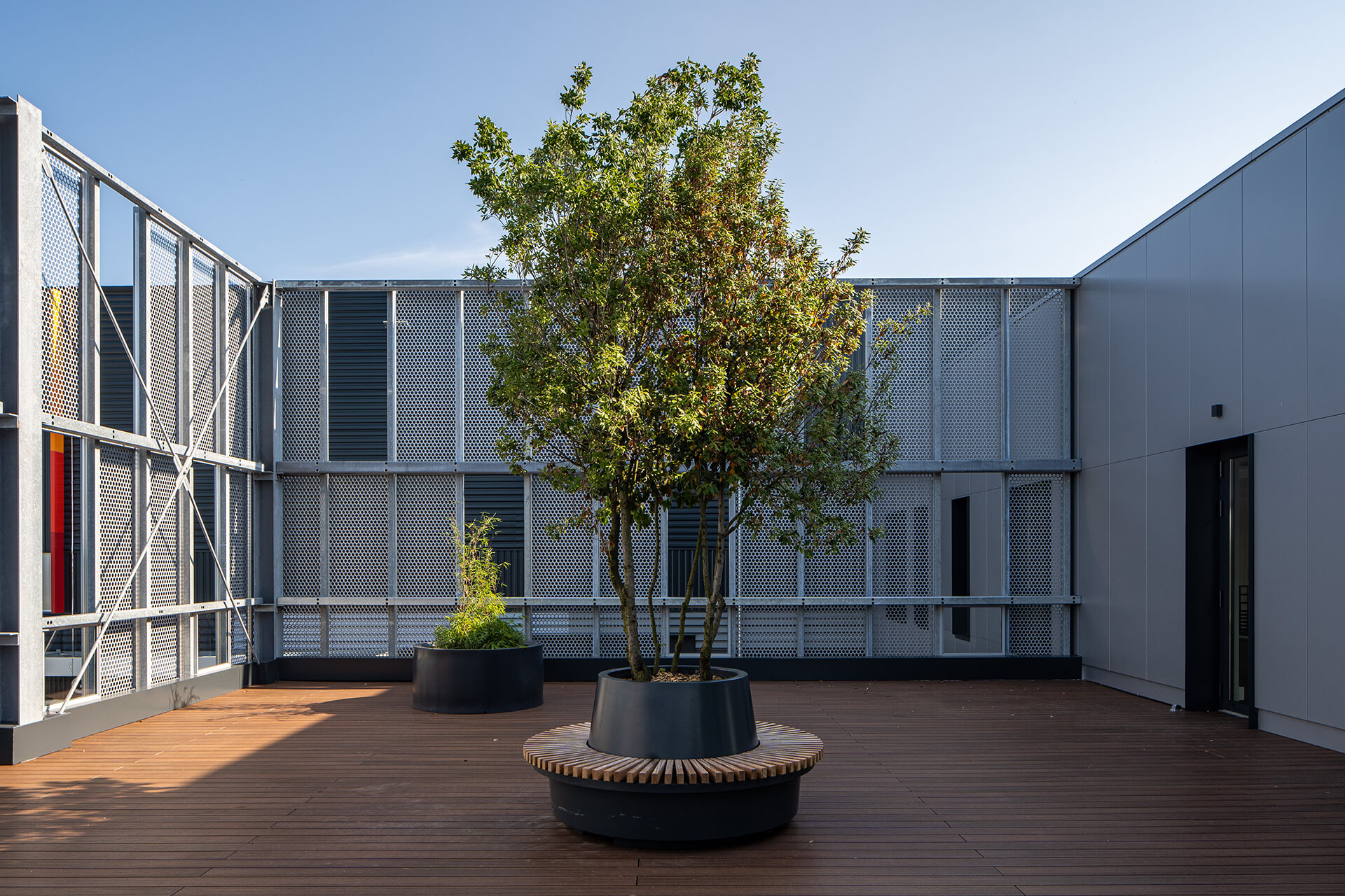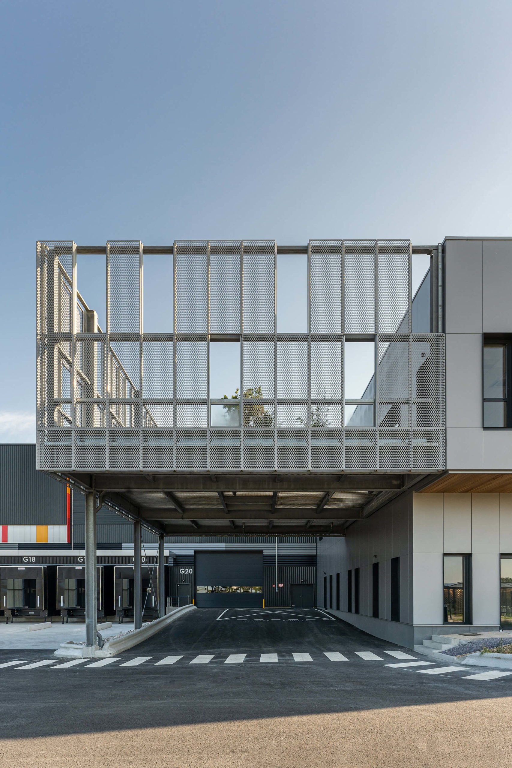 Une terrasse panoramique surplombant la cour poids lourd sert d’espace détente pour les usagers du projet. Ce projet est pourvu d’une labellisation BREEAM Niveau Good.