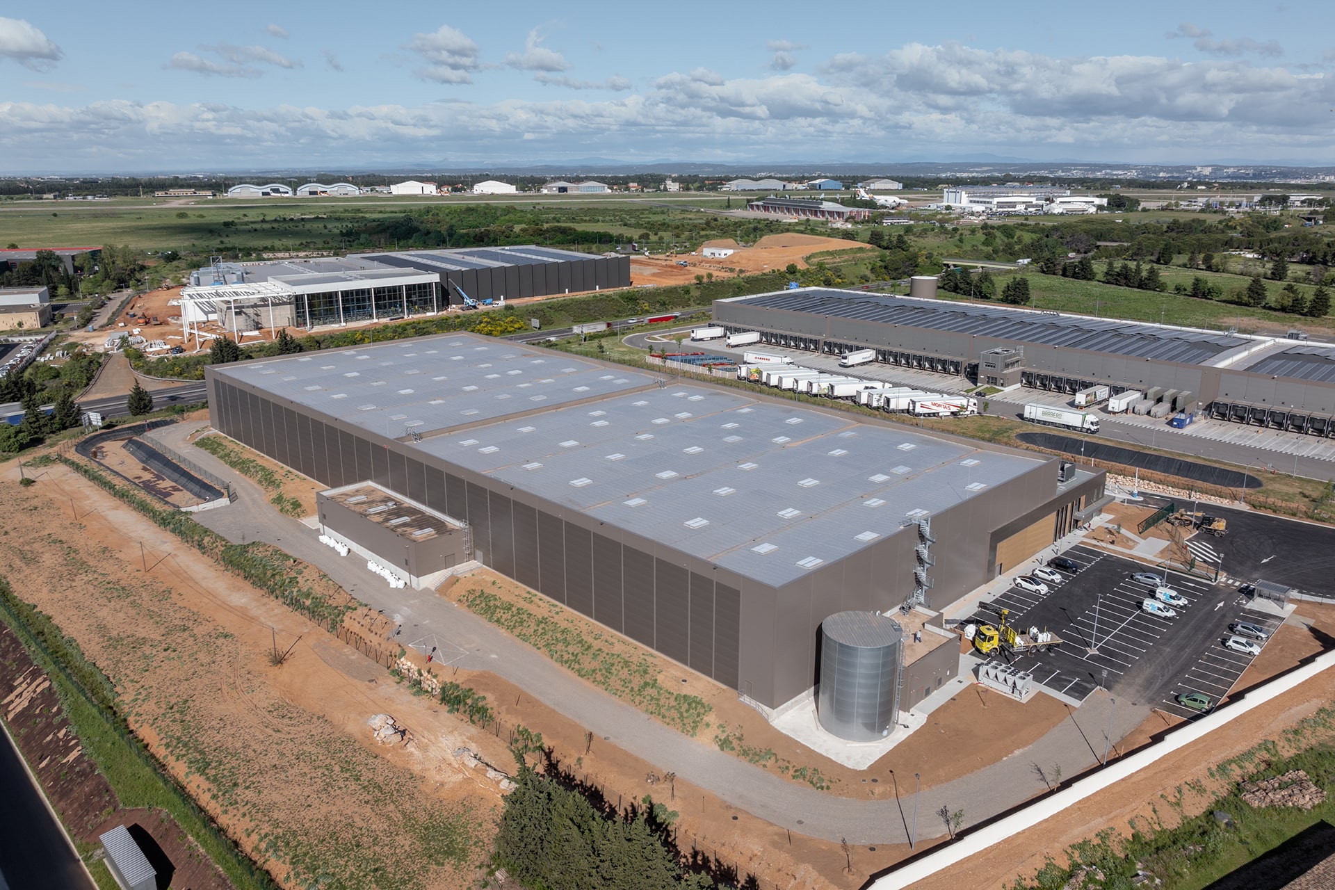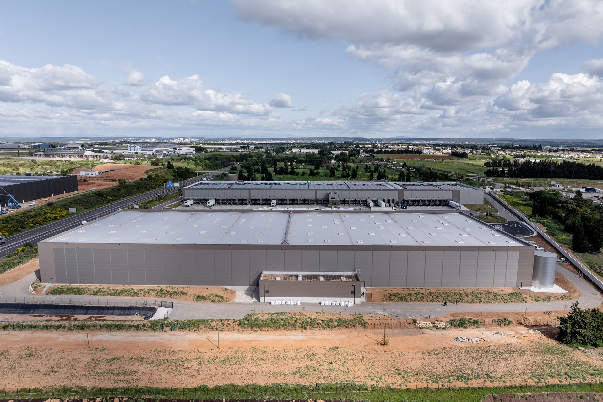 Le site comporte par ailleurs une zone extérieure pour l’installation des onduleurs dédiés à la centrale photovoltaïque, une zone d’attente PL, 2 poches de parking pour les véhicules légers et un bassin de rétention des eaux d’extinction incendie complète l’aménagement du site.