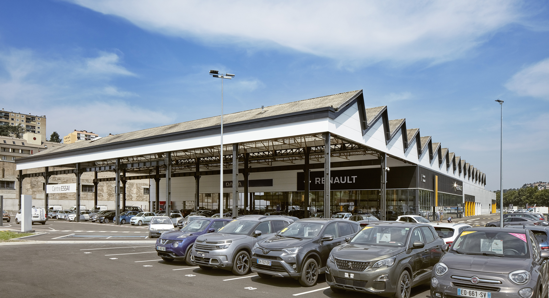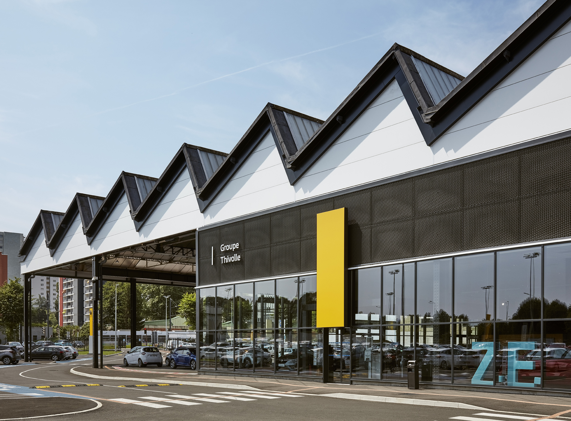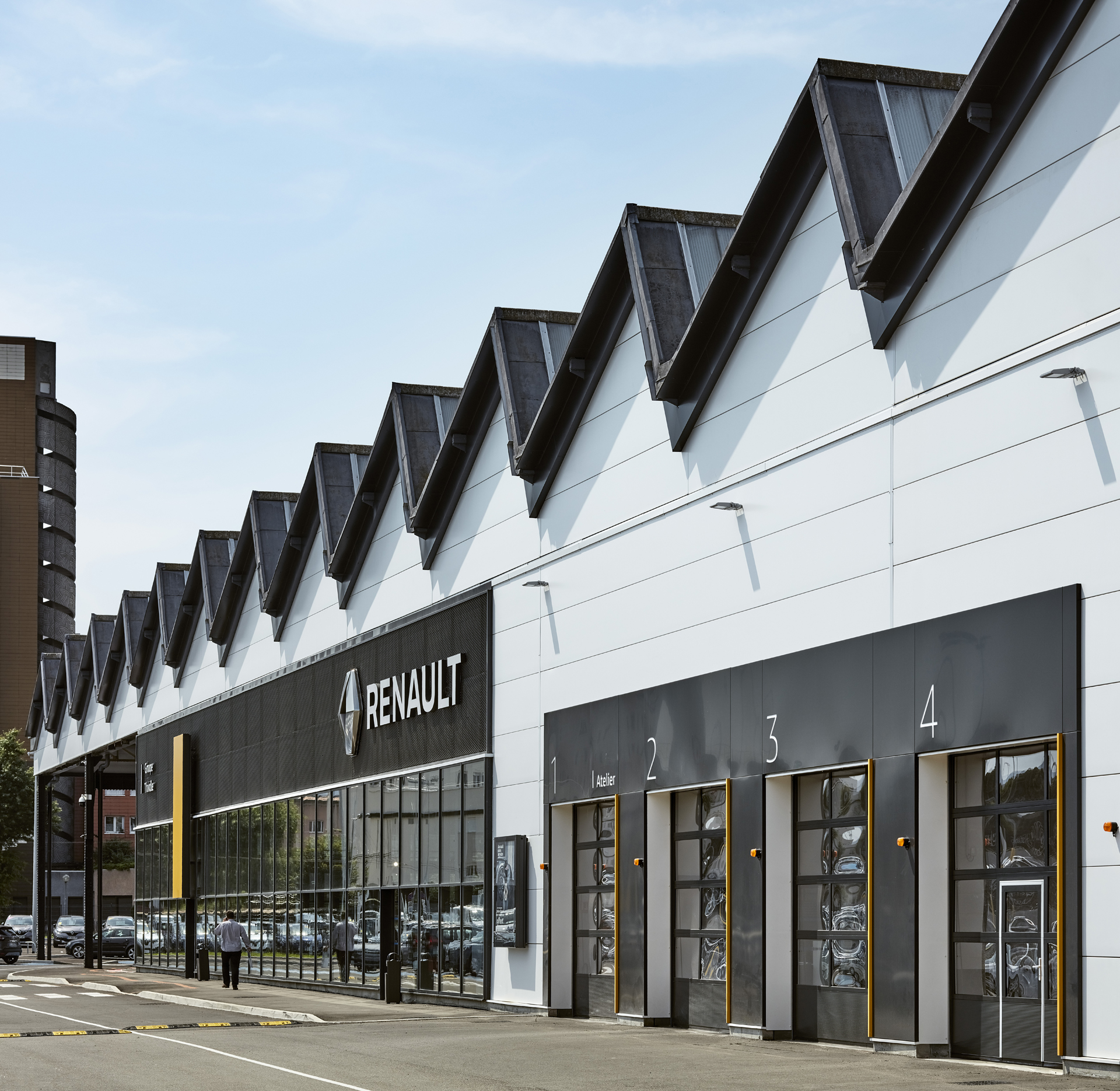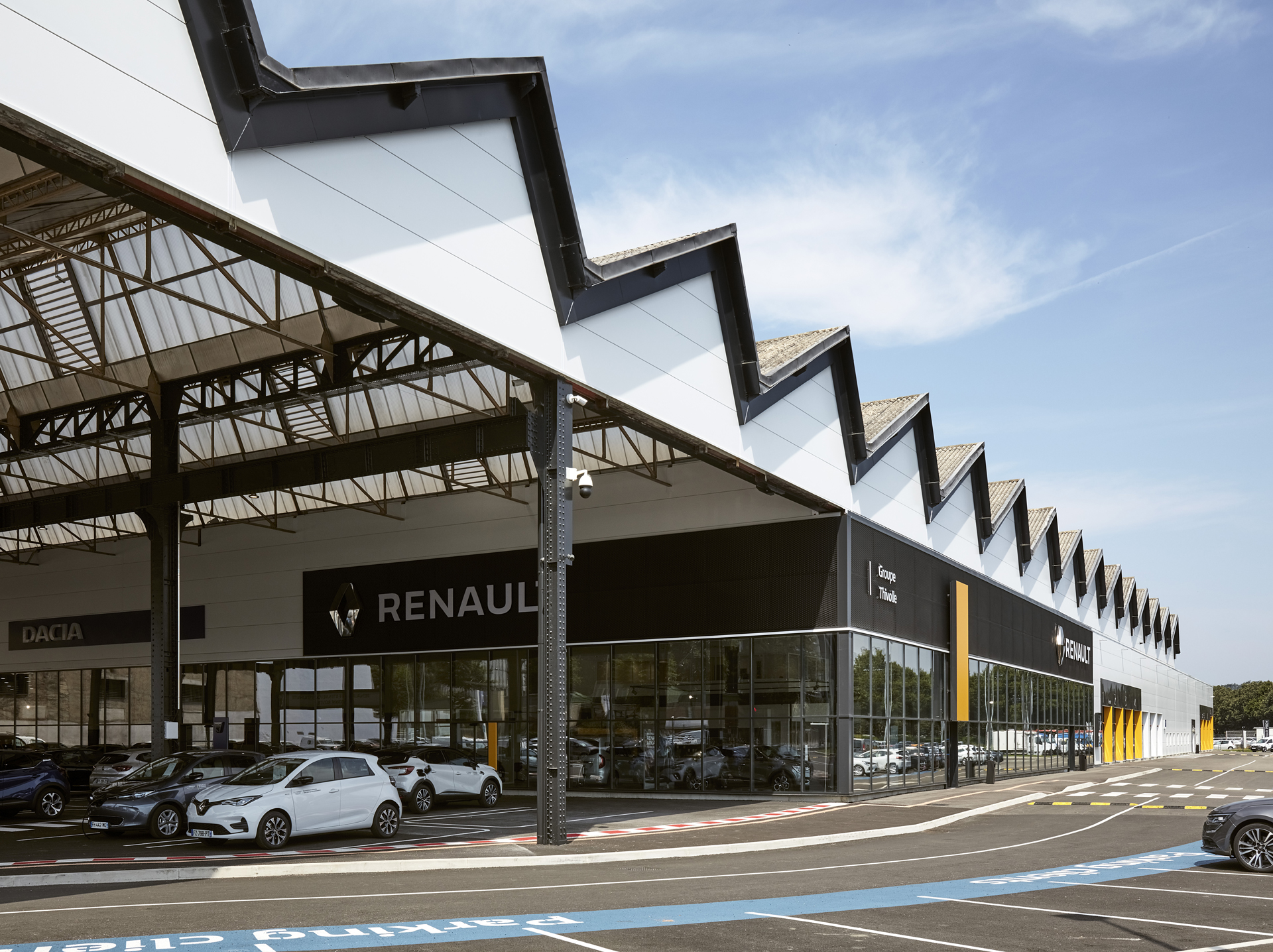 La charpente historique, de conception type « Eiffel », est ainsi mise en valeur à travers un vaste auvent sous lequel les visiteurs vont circuler pour rejoindre les différents espaces du projet : showroom, espaces véhicules occasion, ateliers d’entretien, ateliers utilitaires, etc… Une grande lisibilité du site est à présent proposée aux clients, avec une cohérence forte entre façades et usages.