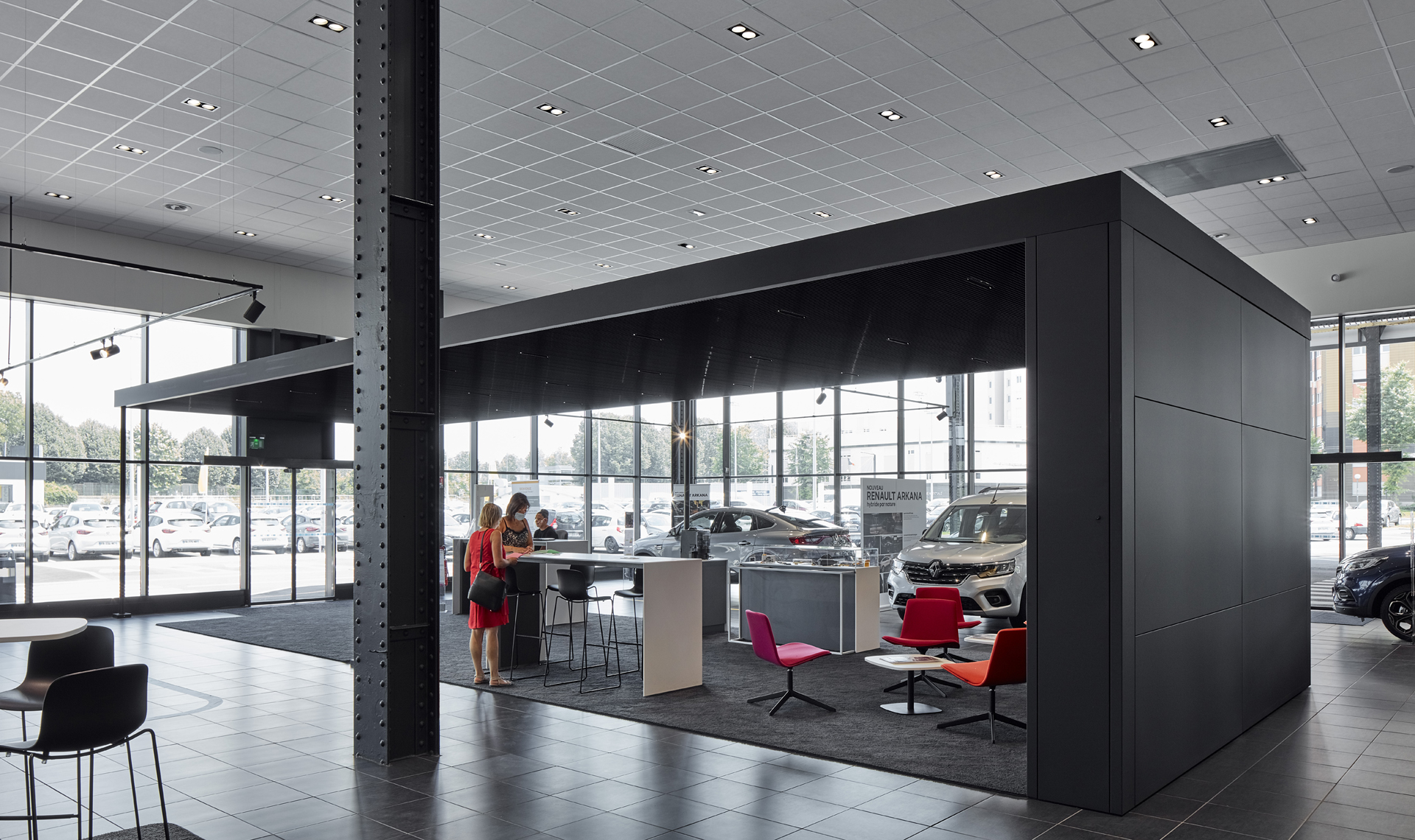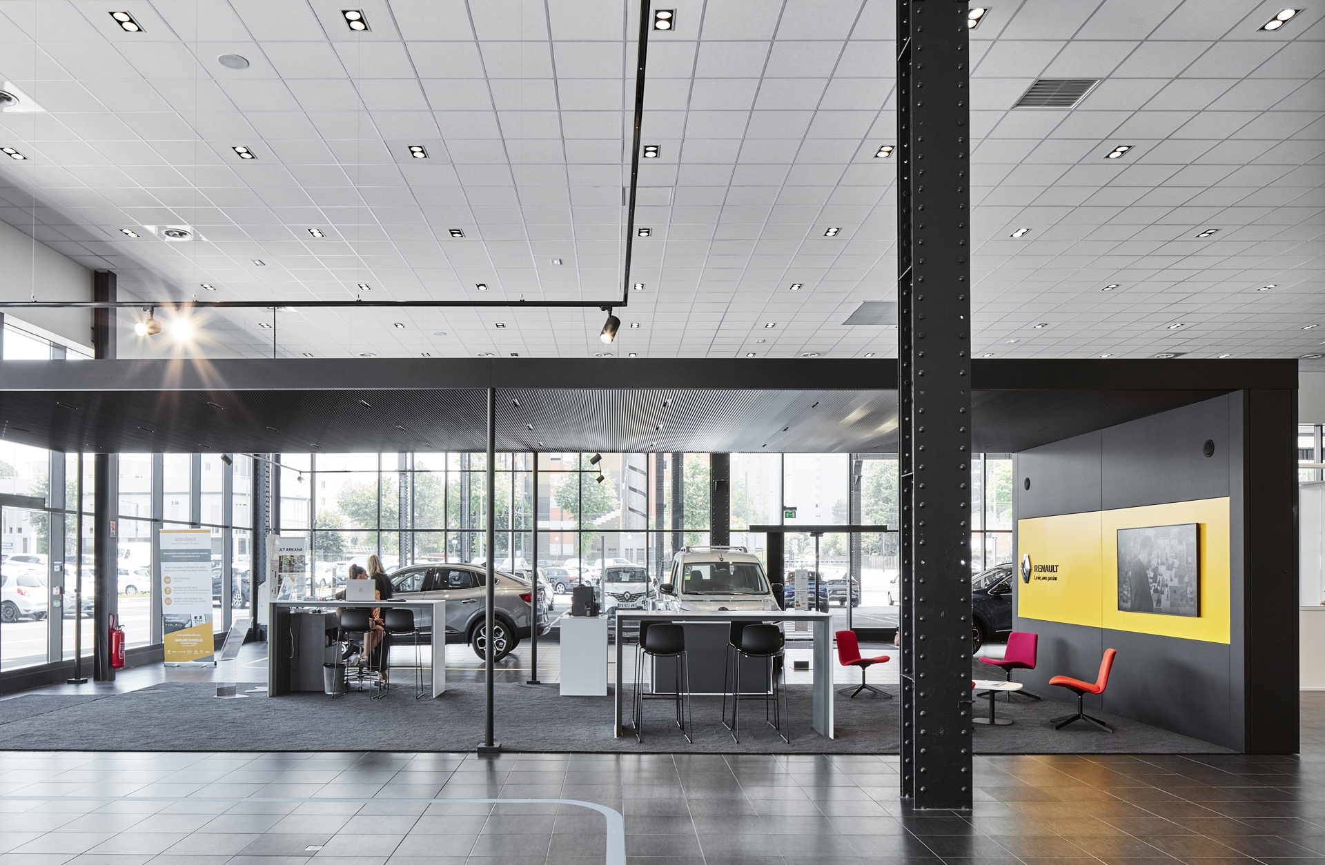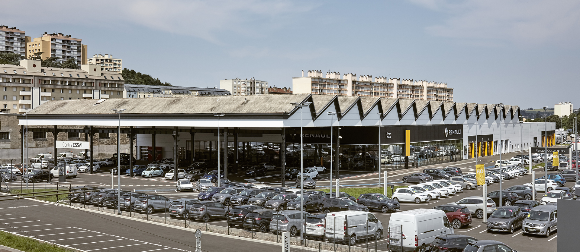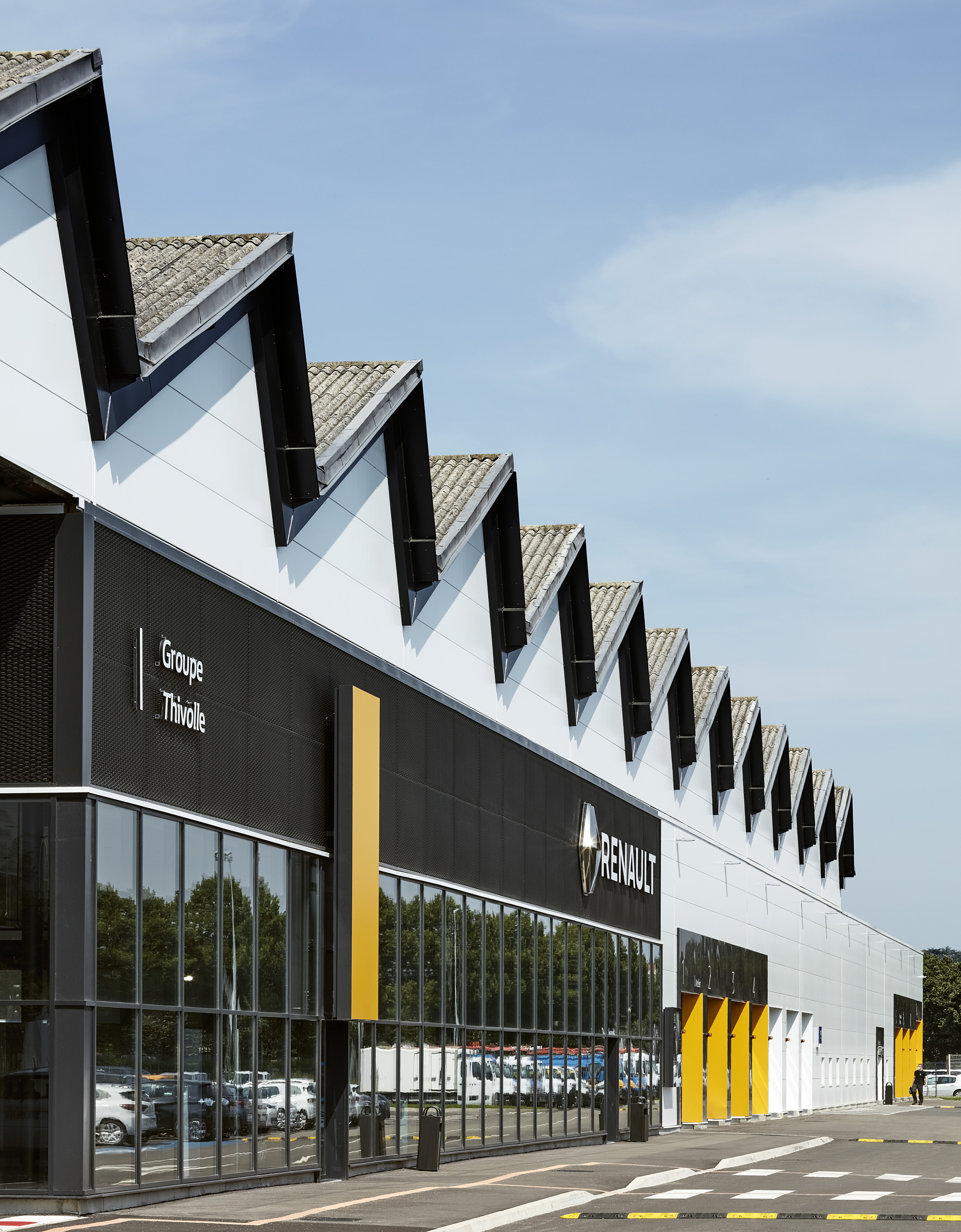 La charpente historique, de conception type « Eiffel », est ainsi mise en valeur à travers un vaste auvent sous lequel les visiteurs vont circuler pour rejoindre les différents espaces du projet : showroom, espaces véhicules occasion, ateliers d’entretien, ateliers utilitaires, etc… Une grande lisibilité du site est à présent proposée aux clients, avec une cohérence forte entre façades et usages.