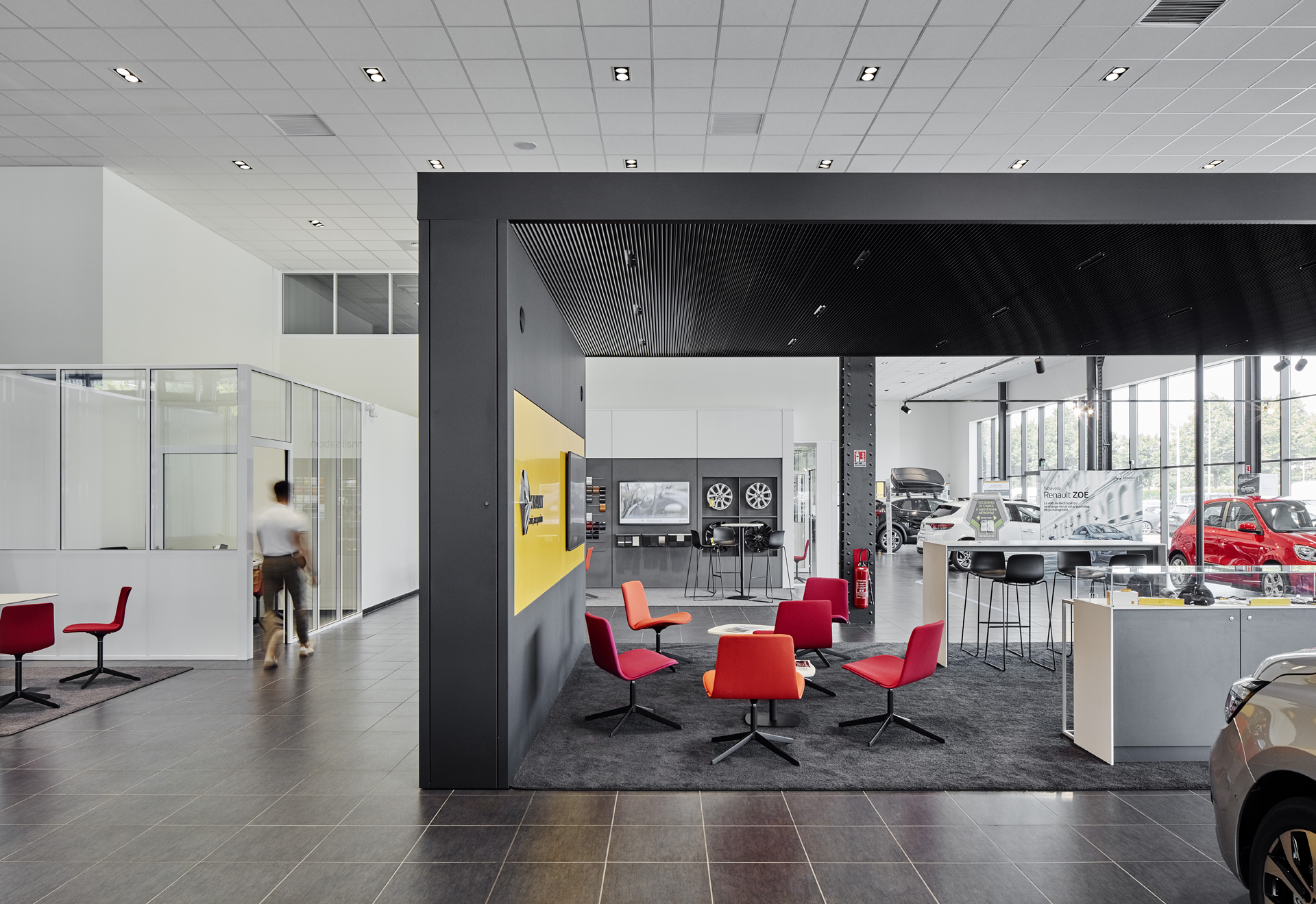 Restructuration lourde d’un site existant important. Dans le but d’optimiser les surfaces, d’améliorer la visibilité de la concession et de tirer profit du passage du tramway, les ateliers 4+ ont proposé de reconfigurer complètement le site, avec notamment d’importantes démolitions. Le site s’est ainsi trouvé complètement modifié, mais a retrouvé à la fois des espaces d’exposition extérieures, mais surtout une nouvelle visibilité.