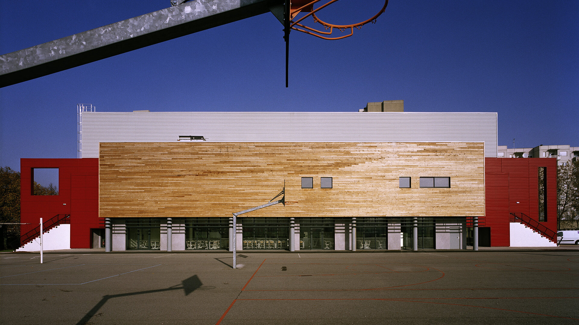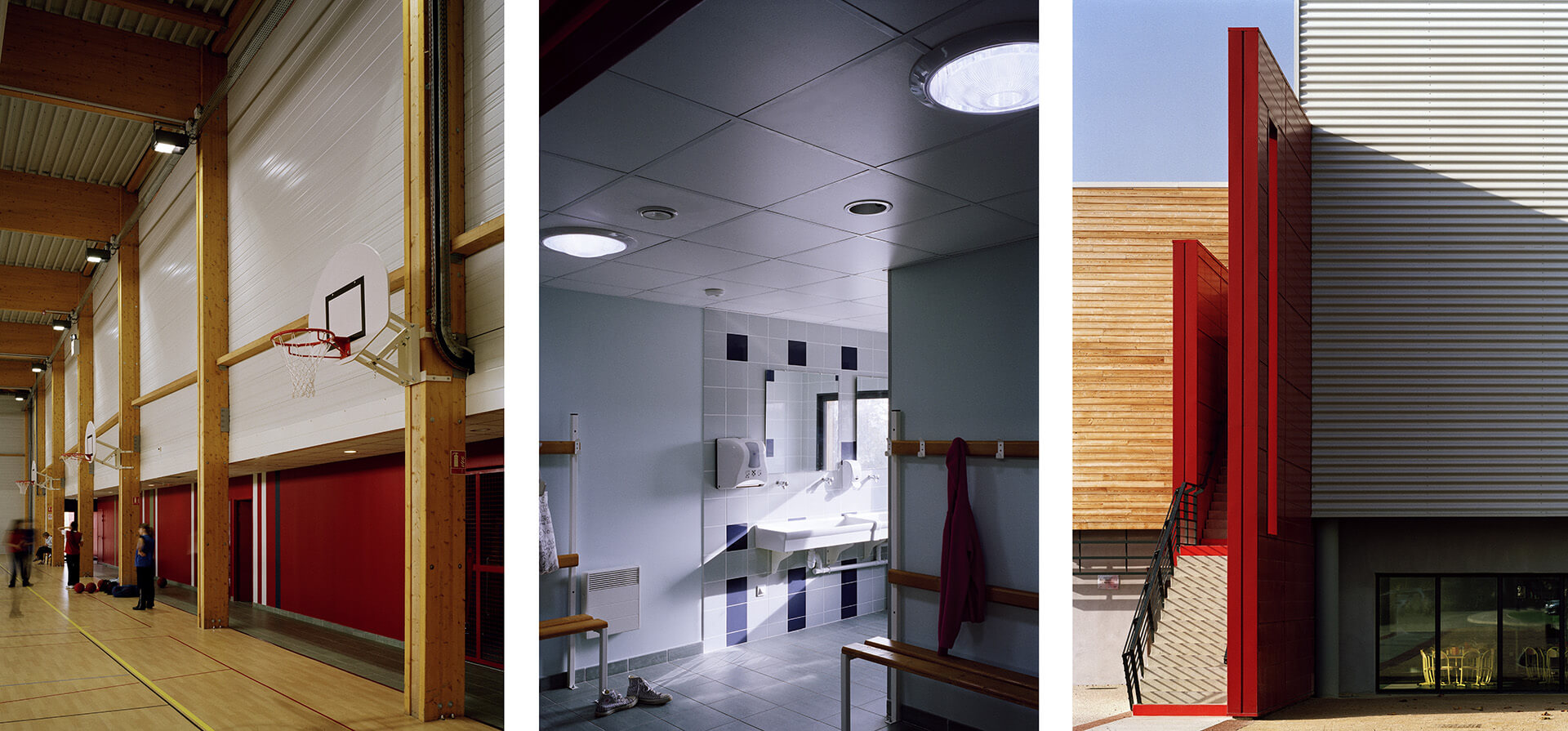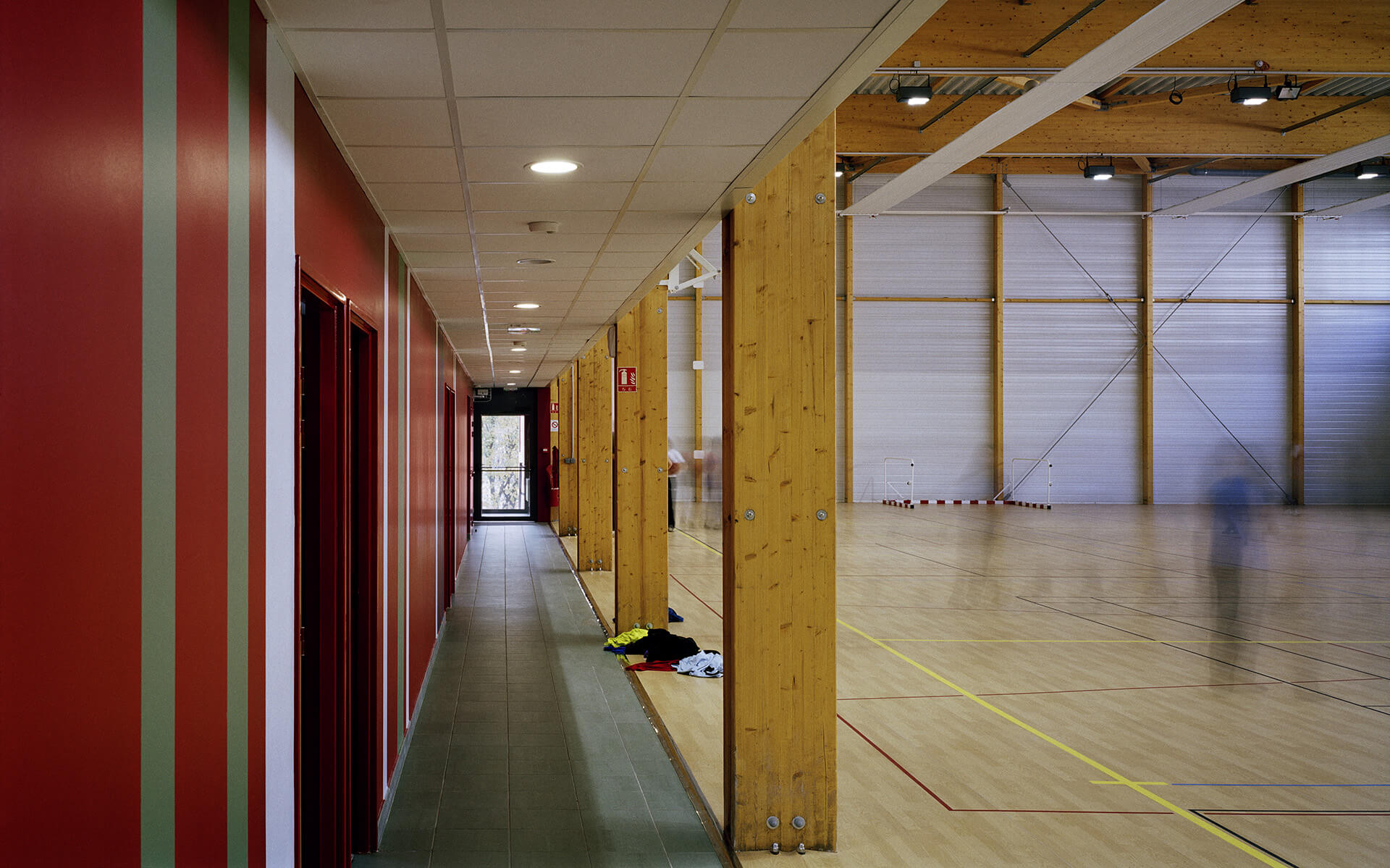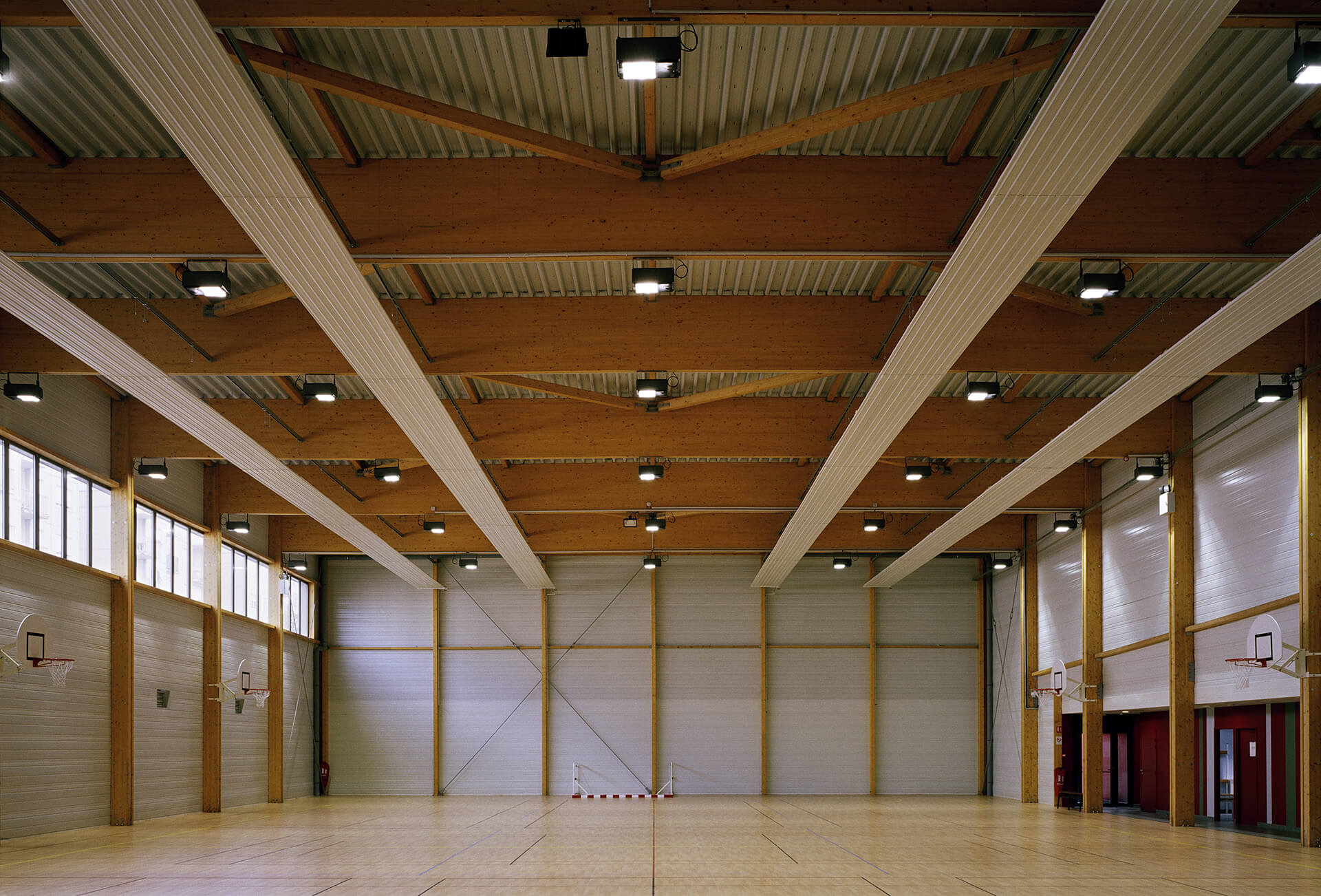 Le gymnase est de type C est a donc des dimensions minimum de 22 m x 44 m. Les annexes regroupent 4 vestiaires, des sanitaires, un bureau des professeurs et un local de rangement du matériel.