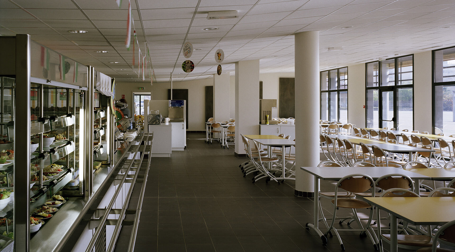 Le restaurant scolaire est divisé en 4 zones : le self, la salle des professeurs, la salle des lycéens et la salle des enfants de l’école maternelle.