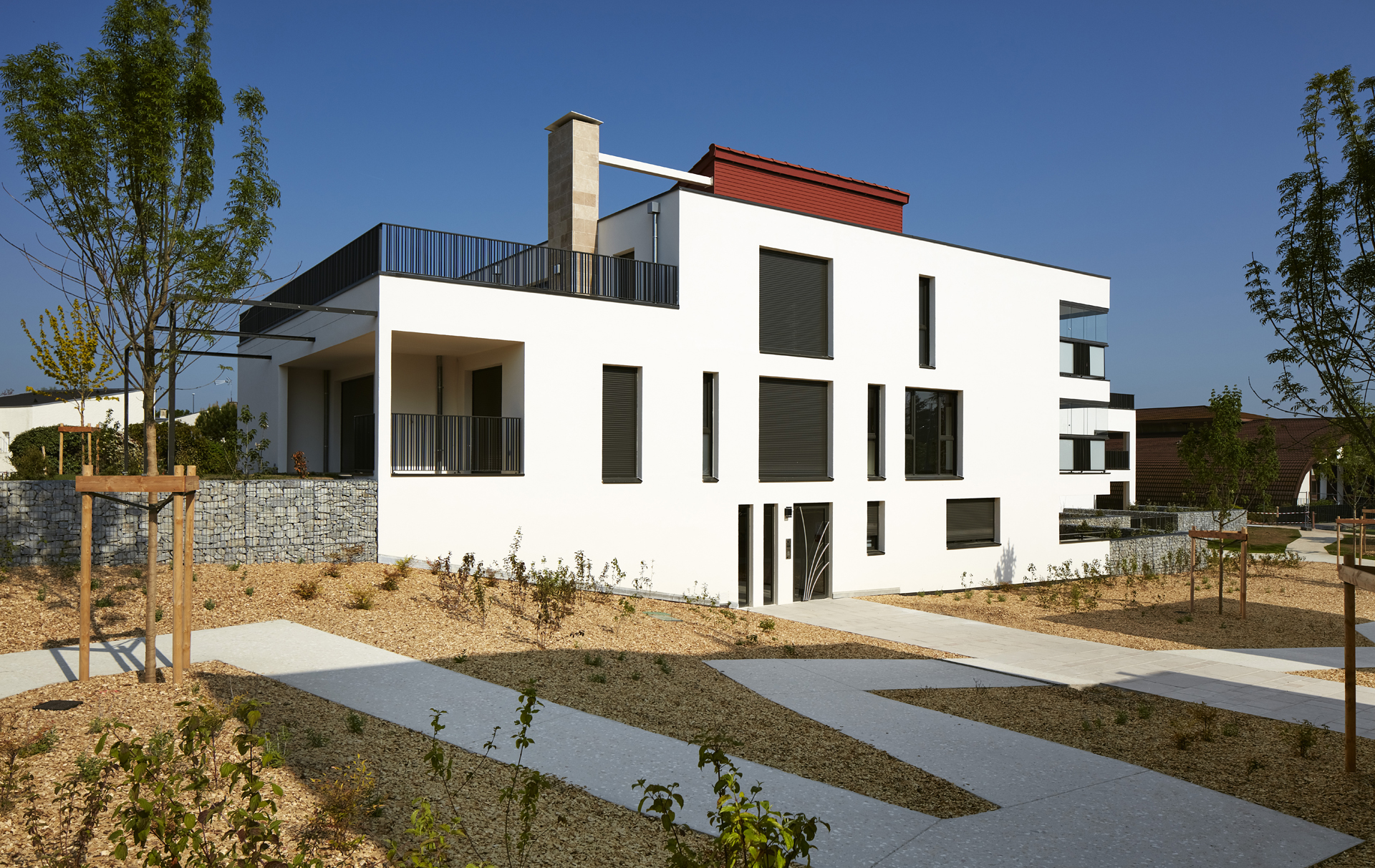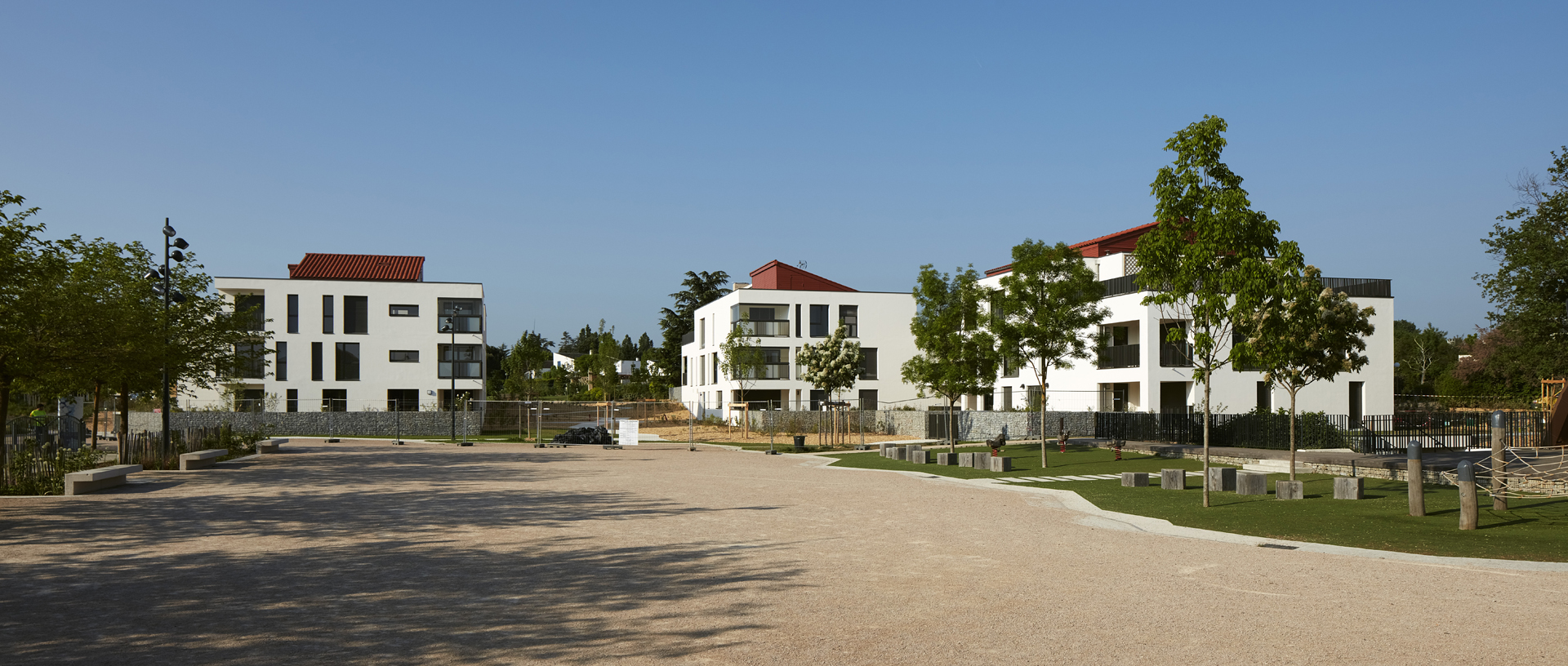 La qualité du lieu se renforce en fonction des usages, ainsi la notion d’immeuble-villa est traduite par le jeu des espaces extérieurs, jardins privés et terrasses en étages.