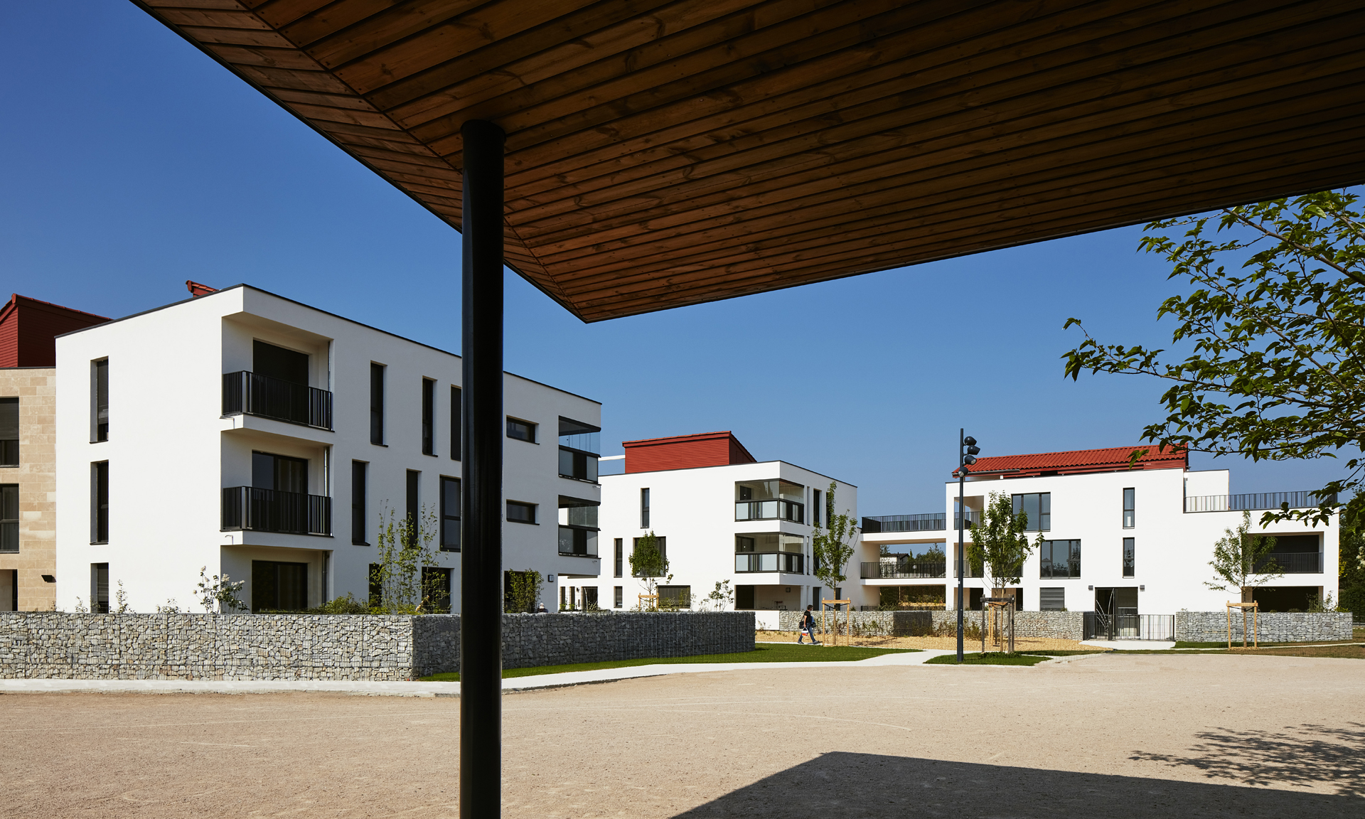 Cette disposition qui permet de ne pas déconnecter la place et le parc, renforce le caractère unitaire de cet espace à l’échelle du village et autorise une grande diversité d’espaces tant du point de vue des configurations du bâti, que des usages proposés. Ainsi le langage de perception d’un village se retrouve (ruelle, porche, transparence, césure, passerelle, terrasse plantée, volumétrie variable et à l’échelle humaine).