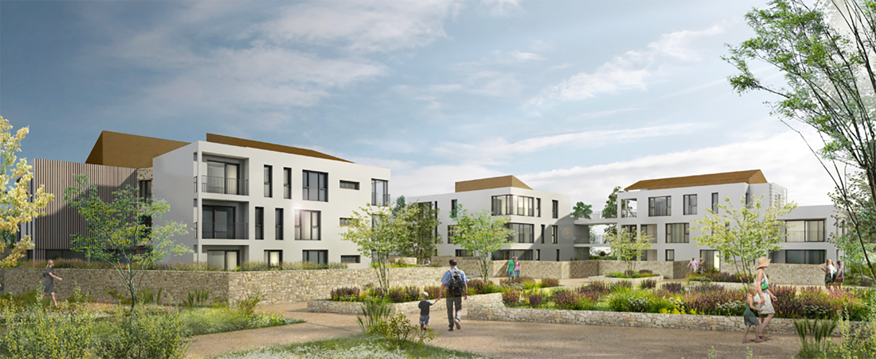 Une construction fractionnée étant envisageable, le projet se décompose en trois volumes principaux, (bâtis à l’échelle du bourg) se répartissant de part et d’autre d’un mail paysagé accessible à tous, absorbant la pente du terrain, privilégiant une lecture séquentielle du bâti, évitant les perceptions de linéaires trop importants, en favorisant les percées visuelles sur les jardins ou sur le parc.
