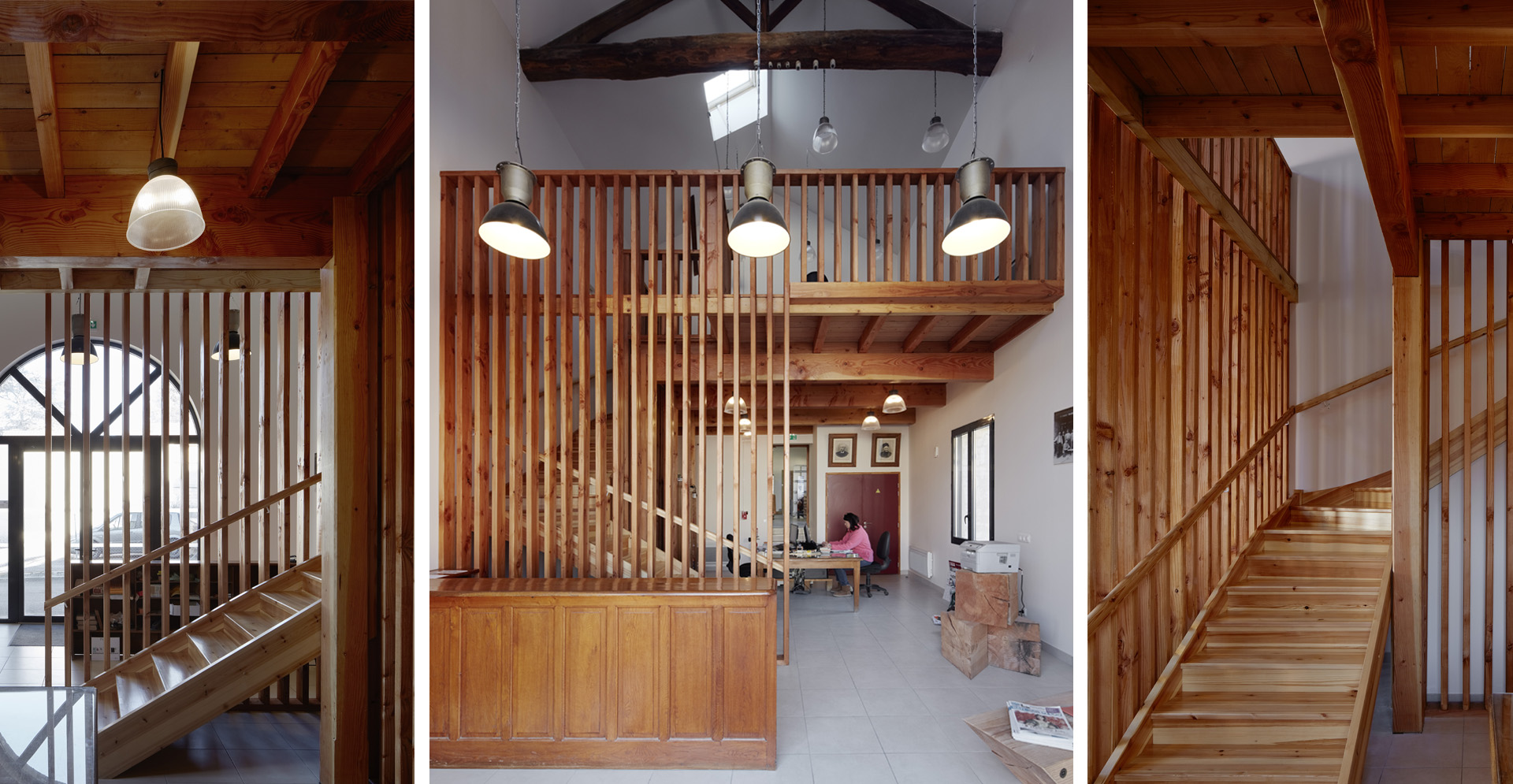 Les nouveaux bureaux ont été installés dans un bâtiment existant complètement restructuré. Atelier 4+ s’est attaché à perpétuer l’histoire du lieu en conservant la charpente existante et en réutilisant des matériels de l’ancien atelier (banque d’accueil, mobilier, luminaires industriels).