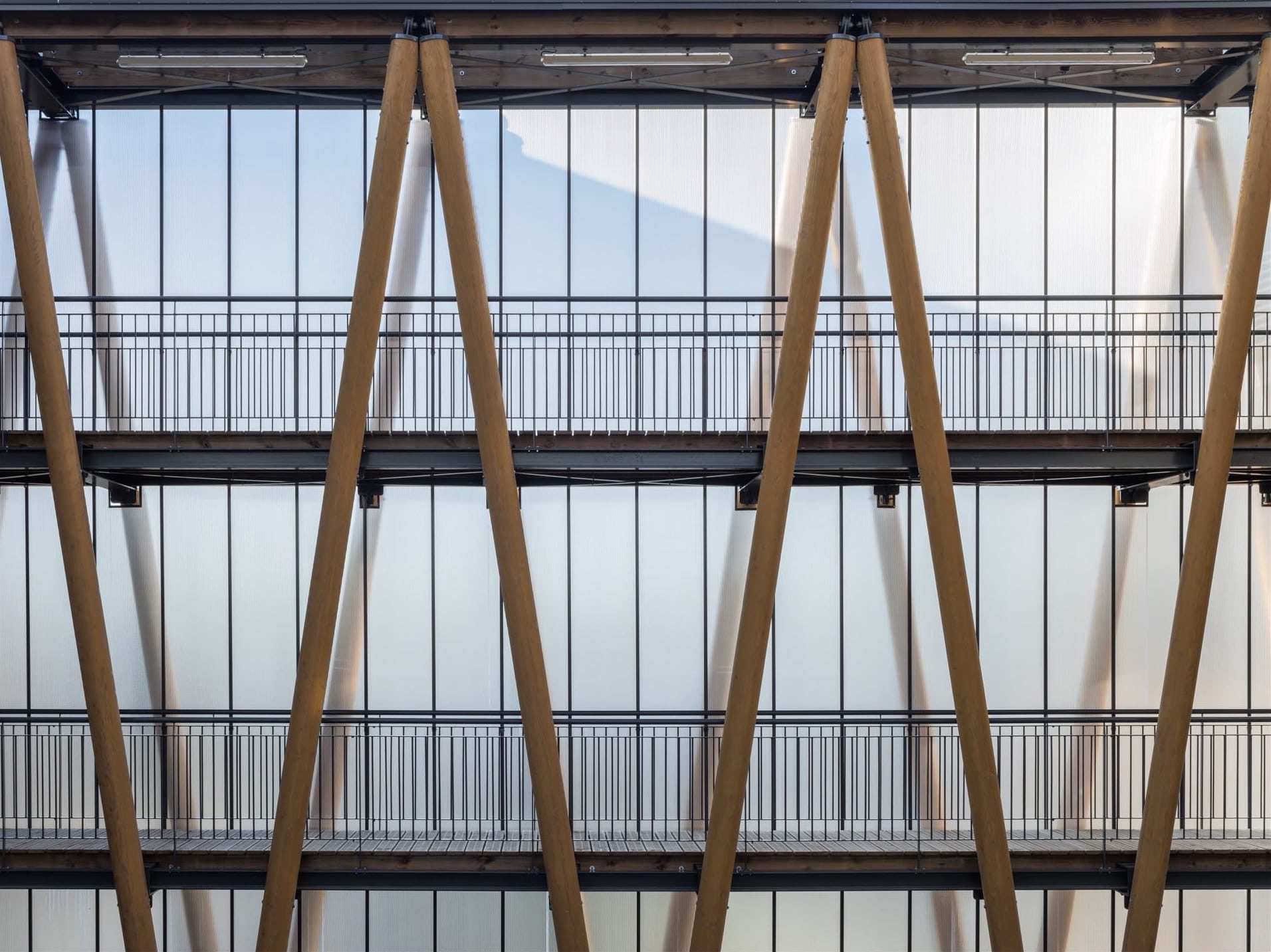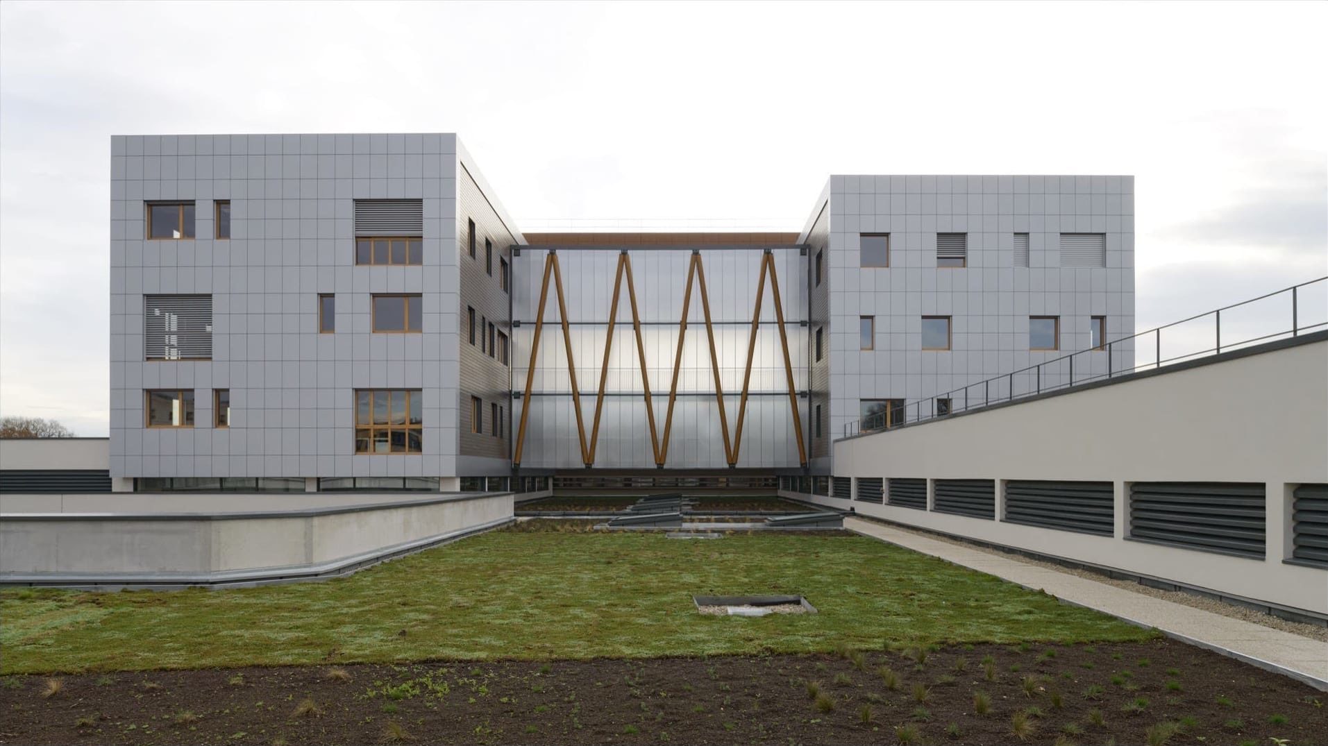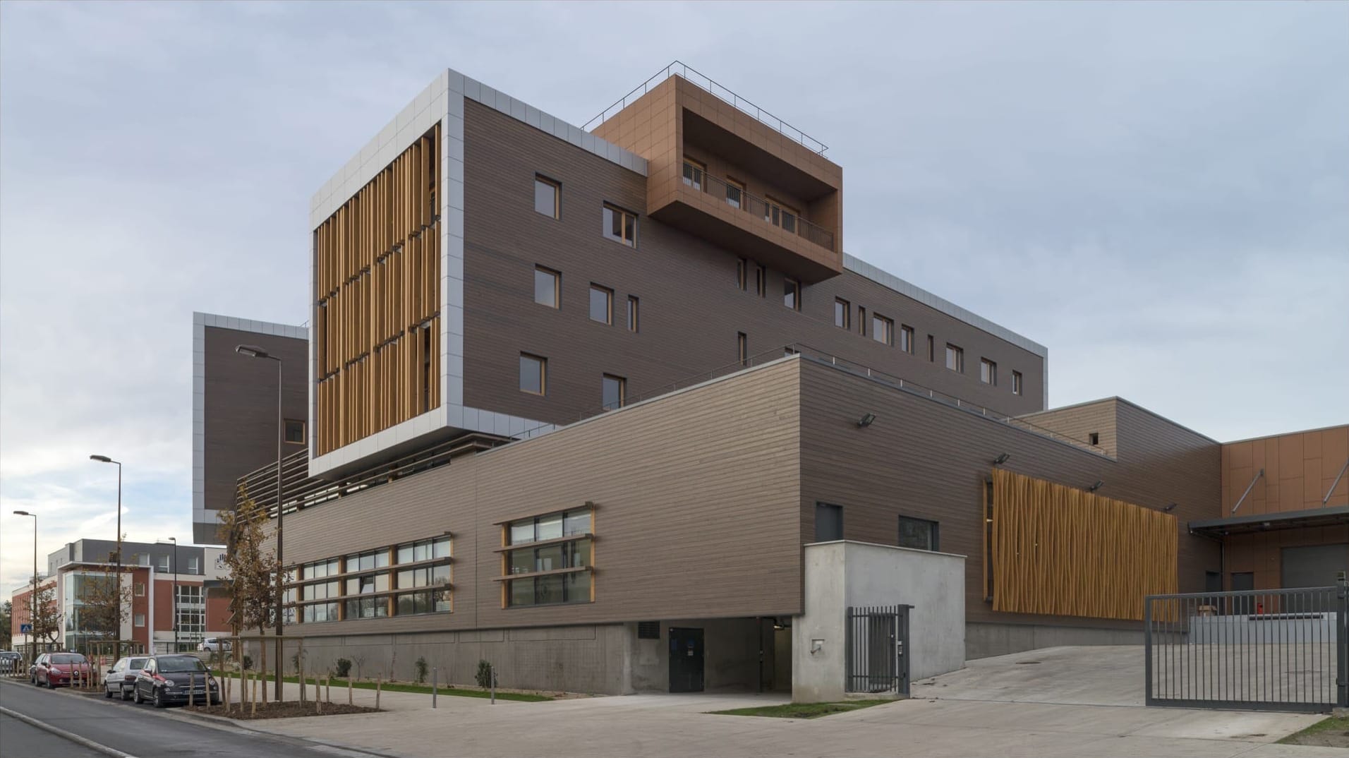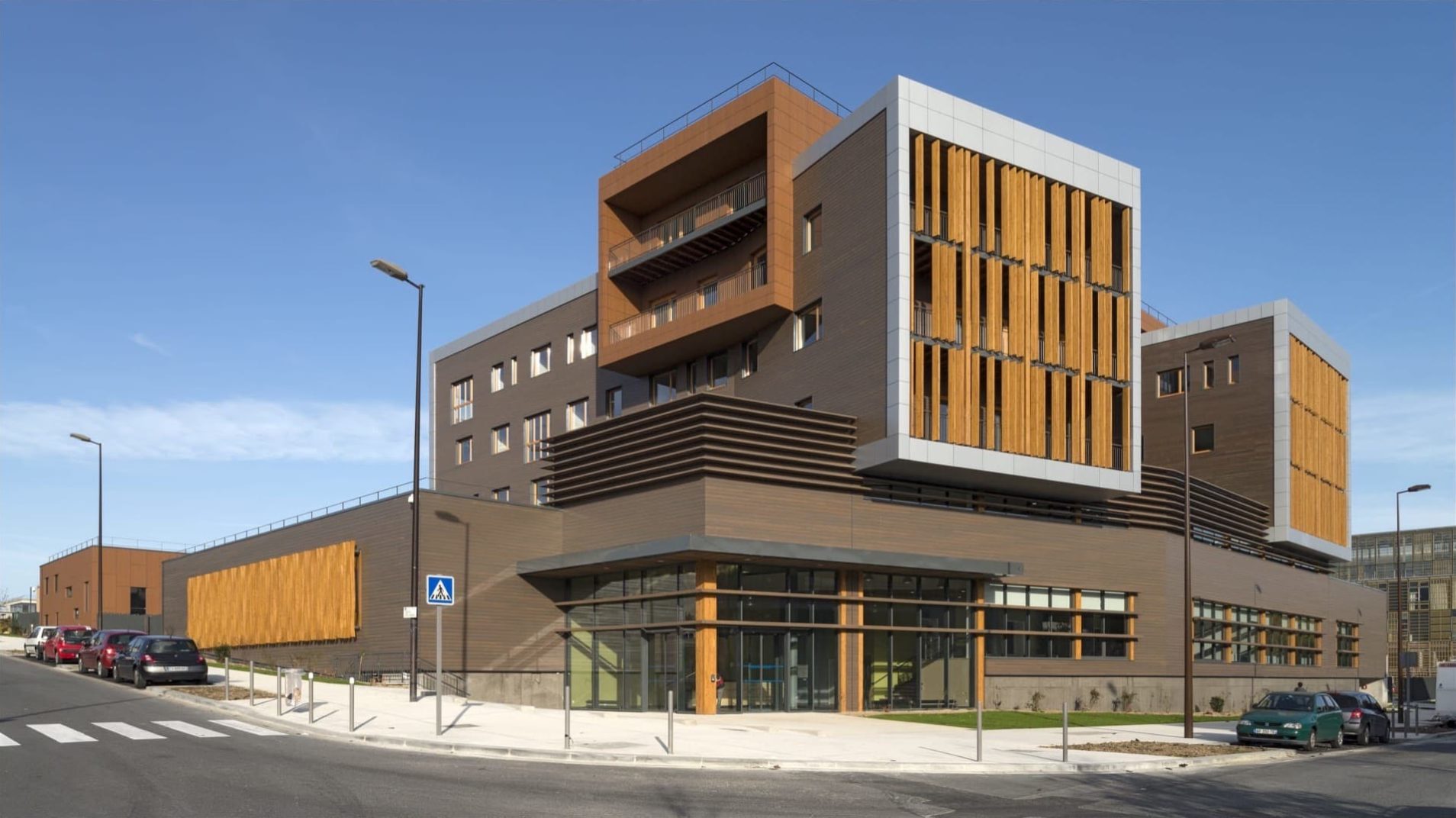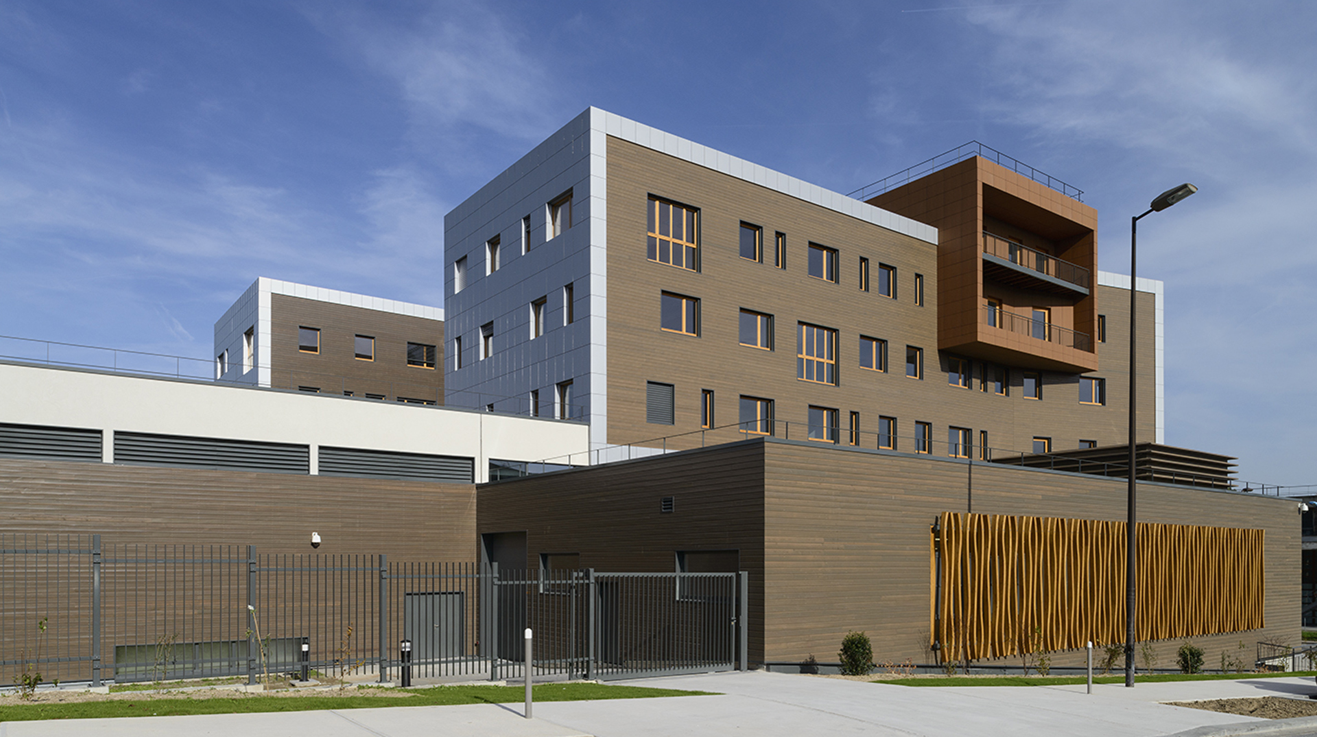 Deux volumes parallèles, aux pignons en porte-à-faux sur la rue Galilée, accueillent les bureaux administratifs sur trois niveaux, une bibliothèque, une materiauthèque, un showroom, un restaurant d’entreprise et un logement de fonction. Ils sont surplombés d’un volume pont regroupant le pôle direction.