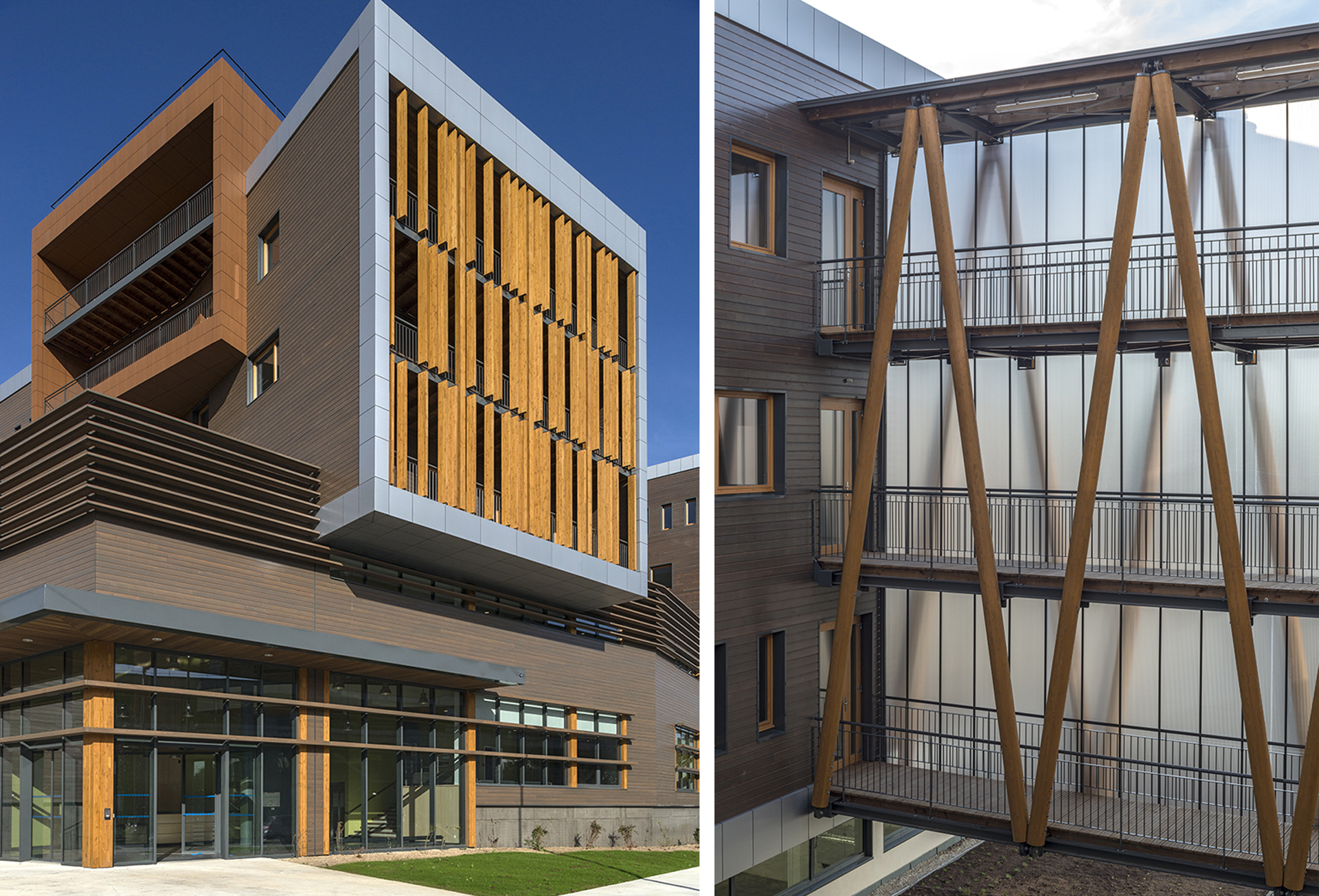 Le FCBA, Institut Technologique Forêt Cellulose Bois-construction Ameublement, s’implante au cœur de la cité Descartes, dans un paysage à fort caractère d’une part un milieu boisé d’exception avec la proximité du Bois de Grâce, et d’autre part un environnement urbain concentrant pôle tertiaire supérieur et pôle de recherche et d’enseignement au rayonnement mondial. Le bâtiment projeté de 10 600m² de SHON se compose de différents volumes qui se superposent et s’assemblent comme le jeu Kapla qui repose sur le principe de l’Architecture modulaire et la matière Bois. Un socle d’activité en rez-de-chaussée, volume simple et compact, regroupe les ateliers et laboratoires du pôle «essais et mesures ». L’angle sud-est, traité en transparence, crée un appel depuis le parvis minéral pour marquer l’entrée du bâtiment.