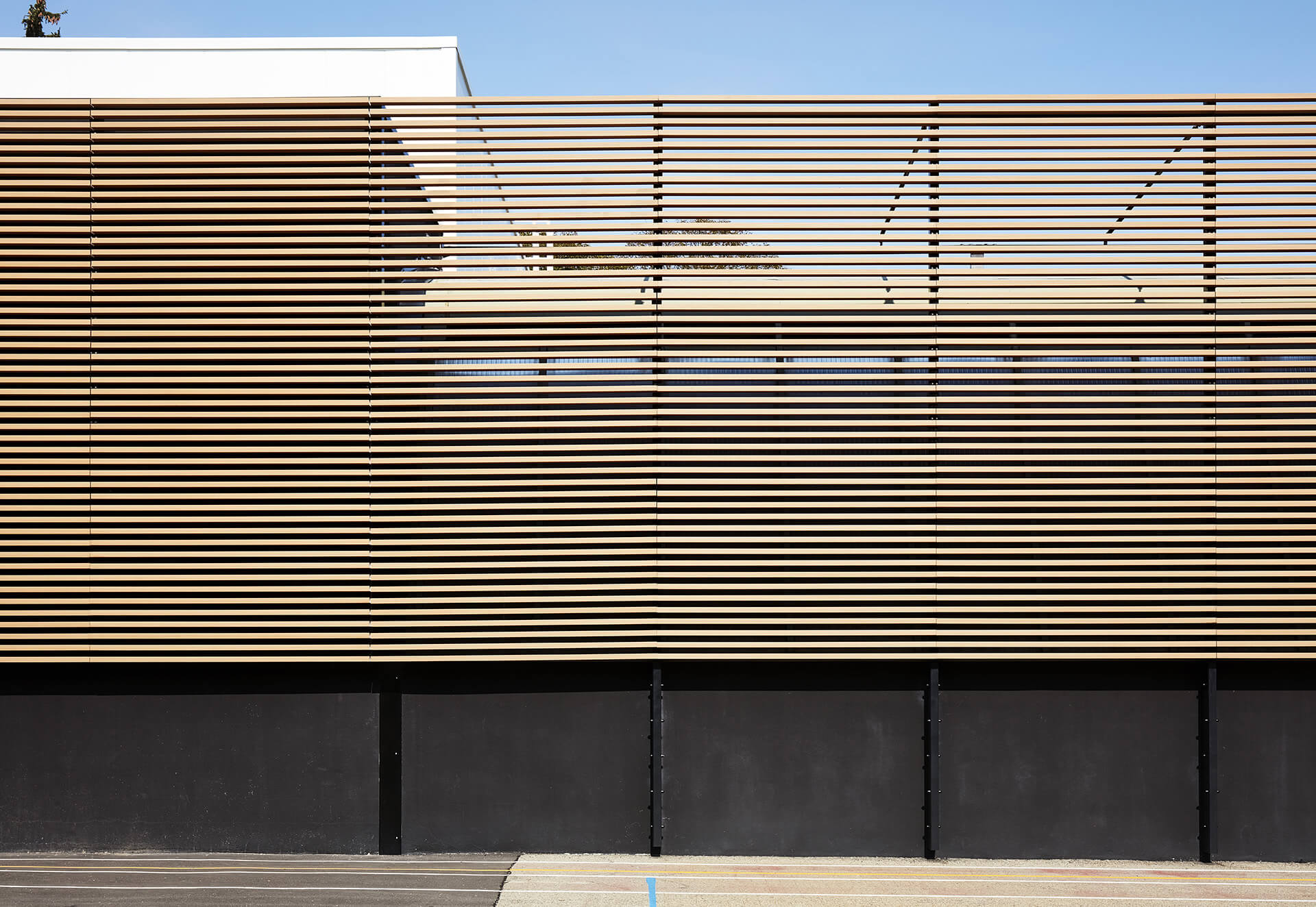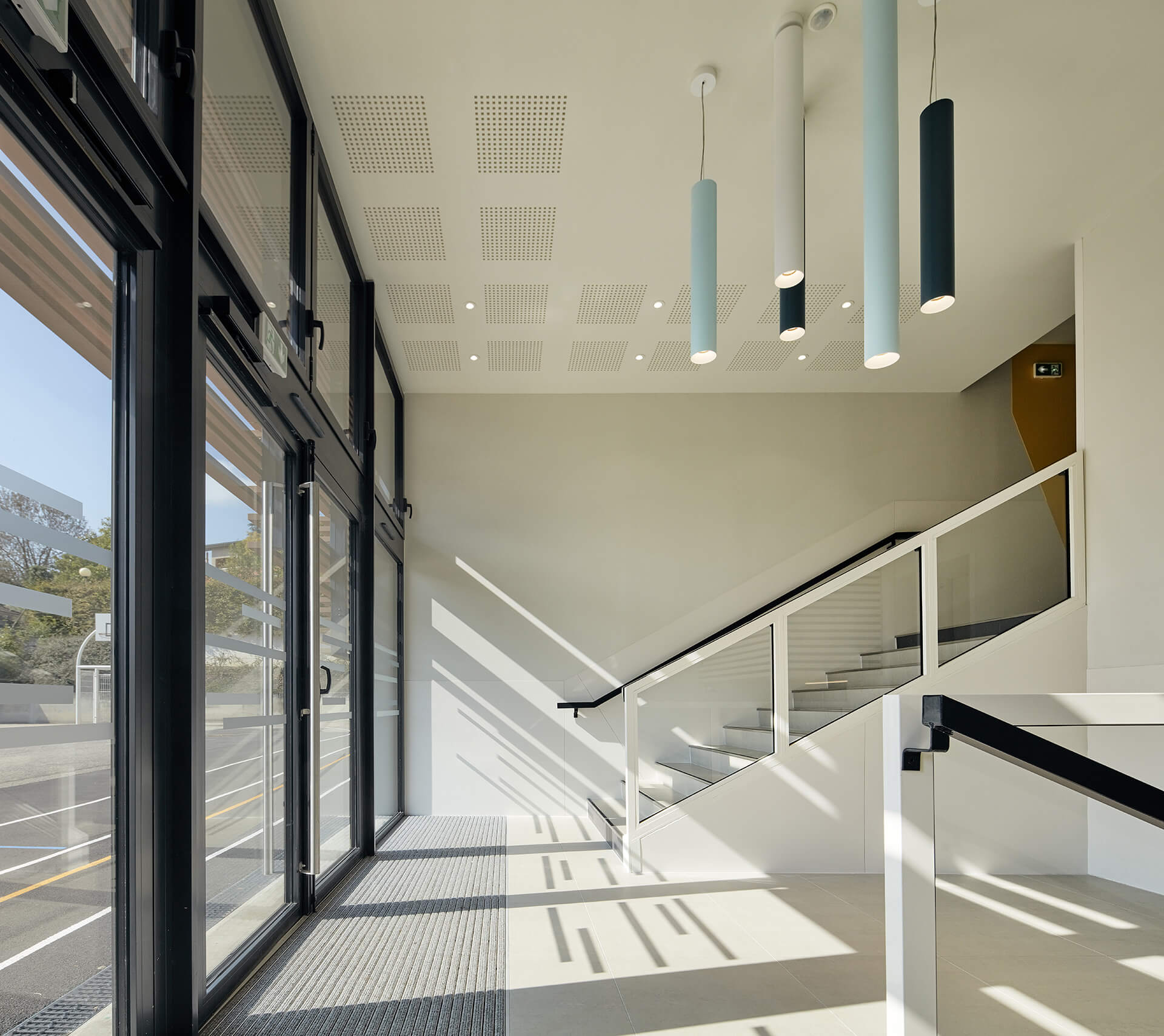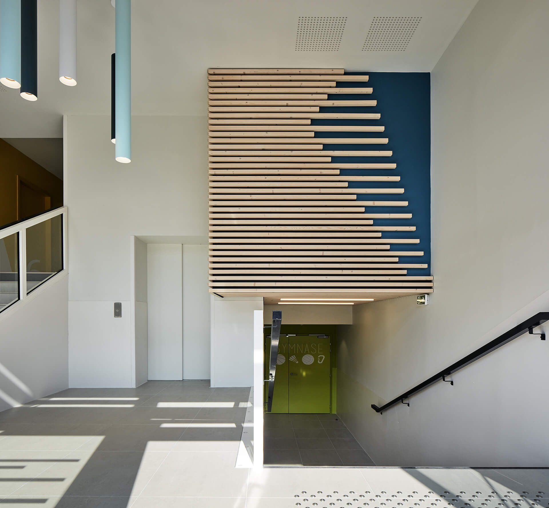 Création d’un hall d’accueil et d’un rangement au niveau du terrain de sport extérieur, intégrant des escaliers et un ascenseur desservant tous les niveaux. Cet espace est intégré derrière une nouvelle façade servant de brise soleil devant la partie vitrée Sud du gymnase existant.