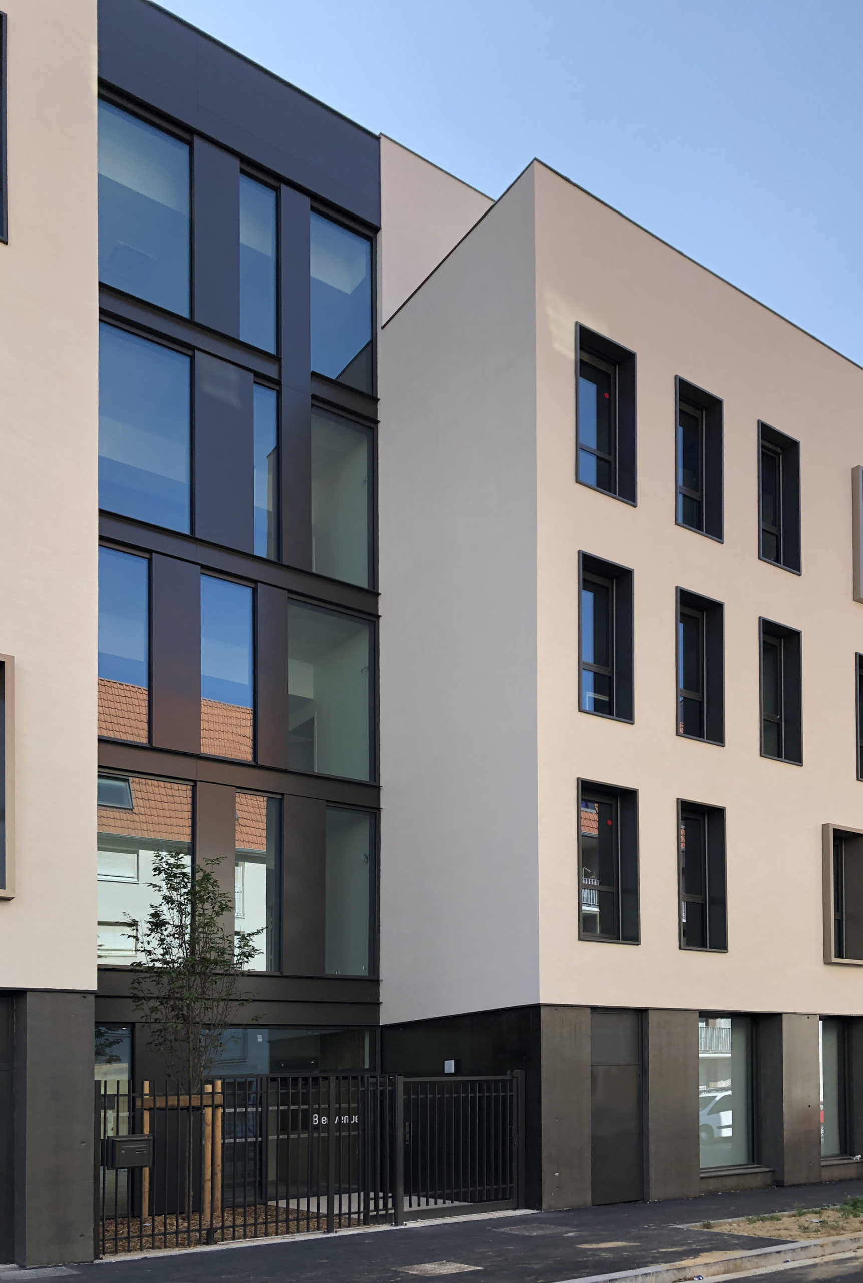 Construction d’un immeuble tertiaire (ERP de 3ème catégorie), ce projet s’inscrit au sein d’un secteur résidentiel et les choix architecturaux visent à favoriser l’insertion du bâtiment dans le contexte urbain. Cela se traduit notamment par une composition des façades s’appuyant sur une logique de baies ponctuelles. Une implantation aléatoire vise néanmoins à donner une certaine singularité à l’opération. L’architecture s’appuie également sur les caractéristiques des bâtiments environnants : mise en évidence d’un soubassement (traité avec un béton lasuré de teinte gris foncé), enduit de teinte blanc cassé pour les étages, châssis verticaux. La mise en place de brise-soleil orientable assure une gestion optimisée des apports solaires et lumineux, et offre une animation des façades. L’entrée du bâtiment est mise en valeur par une faille verticale sur toute la hauteur de la façade Est. Une transparence est également proposée vers le cœur d’îlot.
