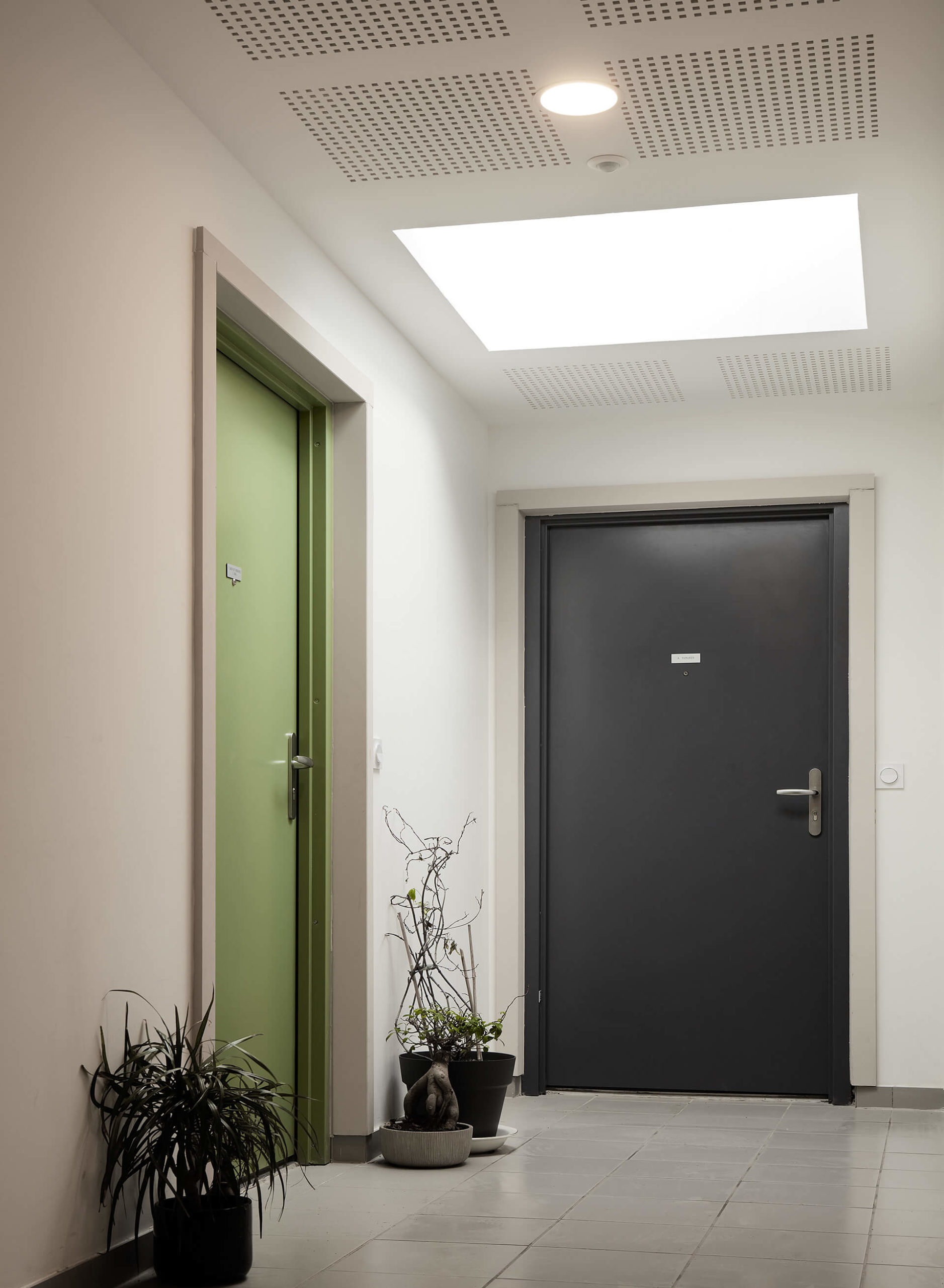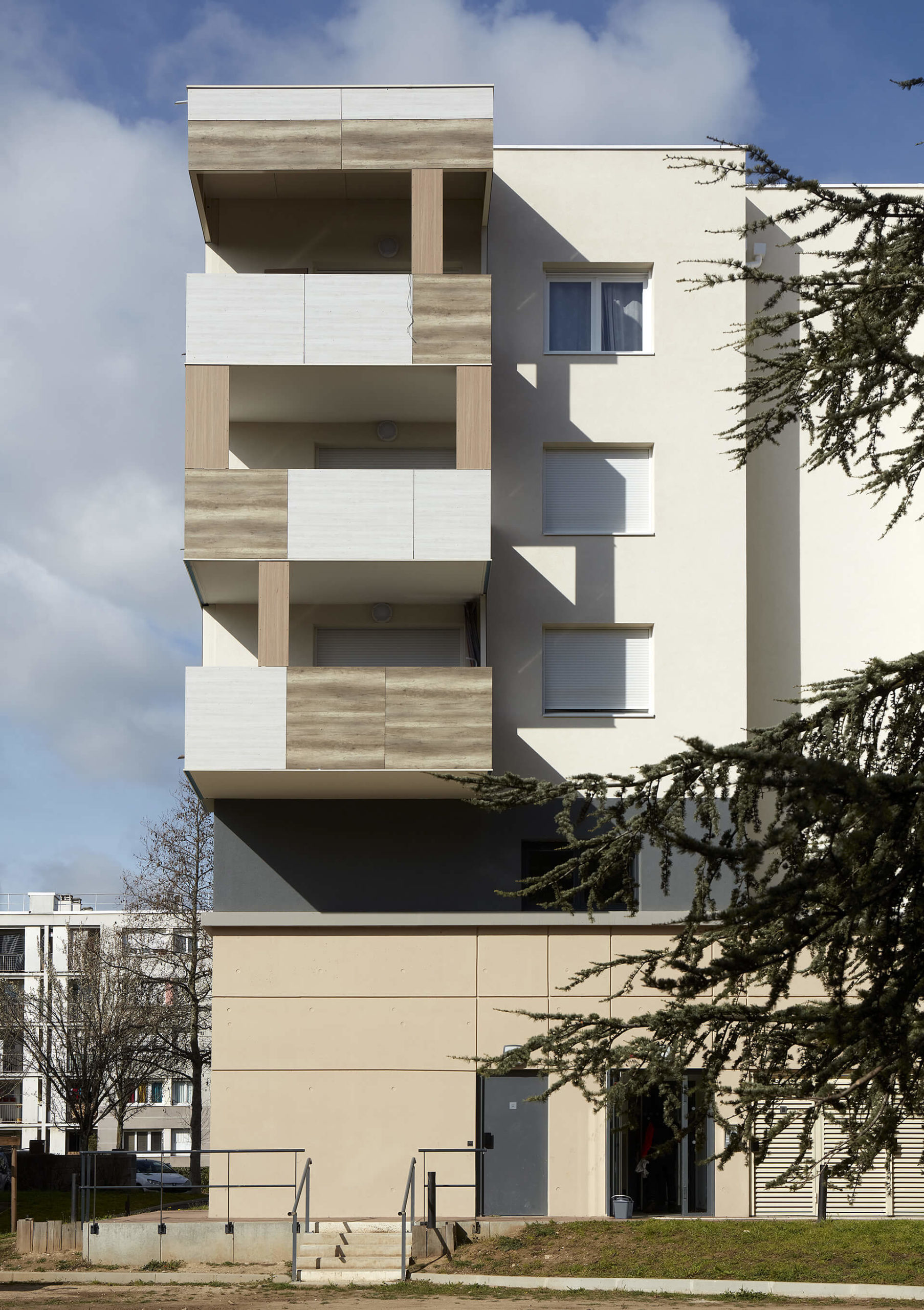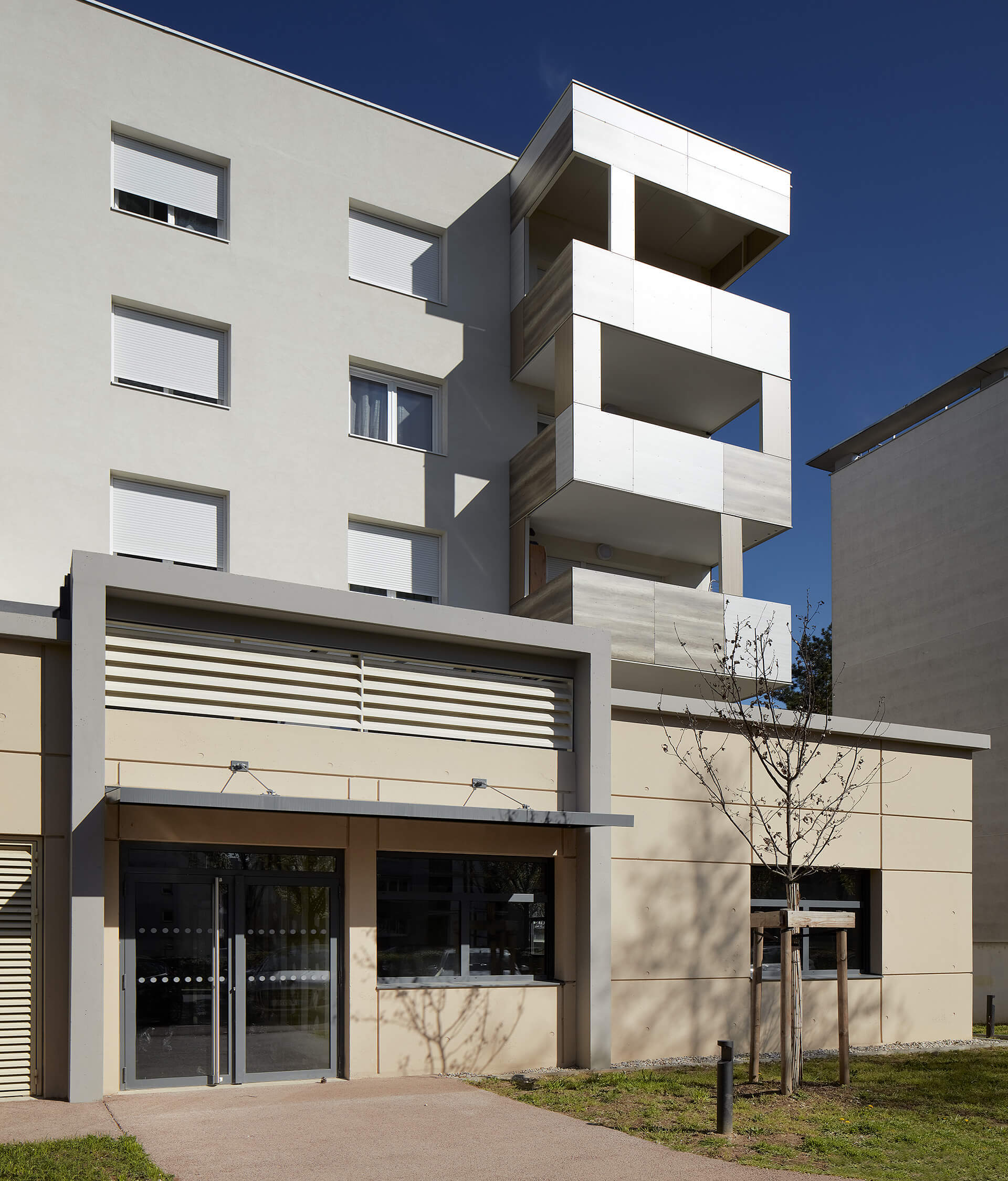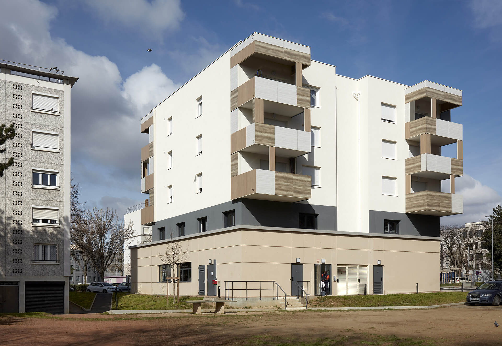 L’accueil du public pour les futurs ERP est orienté façade Ouest sur le boulevard Ambroise Croizat, et l’accès à la résidence séniors est identifié par une entrée séparée, située en façade Est. Elle est accessible depuis le parking par un chemin. Elle fait face au jardin aménagé en cœur d’îlot, offrant une vue arborée et un espace de rencontre en extérieur accessible par un cheminement en pente douce.