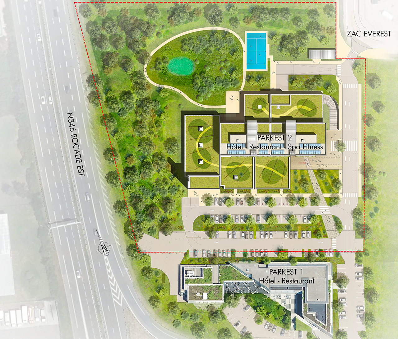 Dans le cadre de ce projet qui profite de sa proximité avec l’Hôtel ParkEst (3*) et son restaurant existants, le projet de résidence hôtelière 4* de 60 chambres ou Suites se développe suivant le programme retenu par la Maîtrise d’Ouvrage sur près de 6100m2 de surface de plancher.