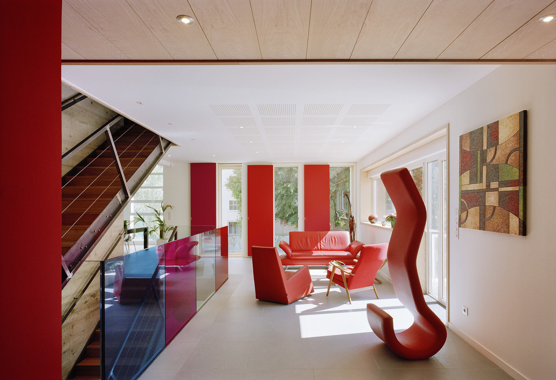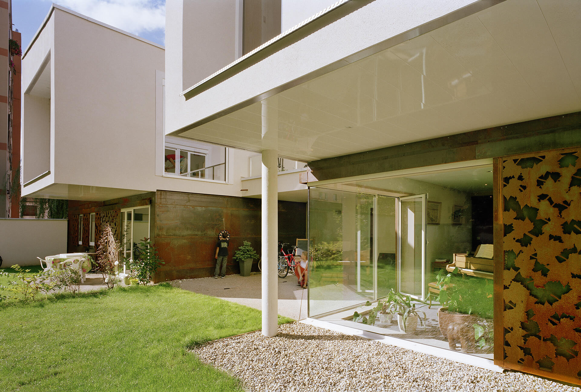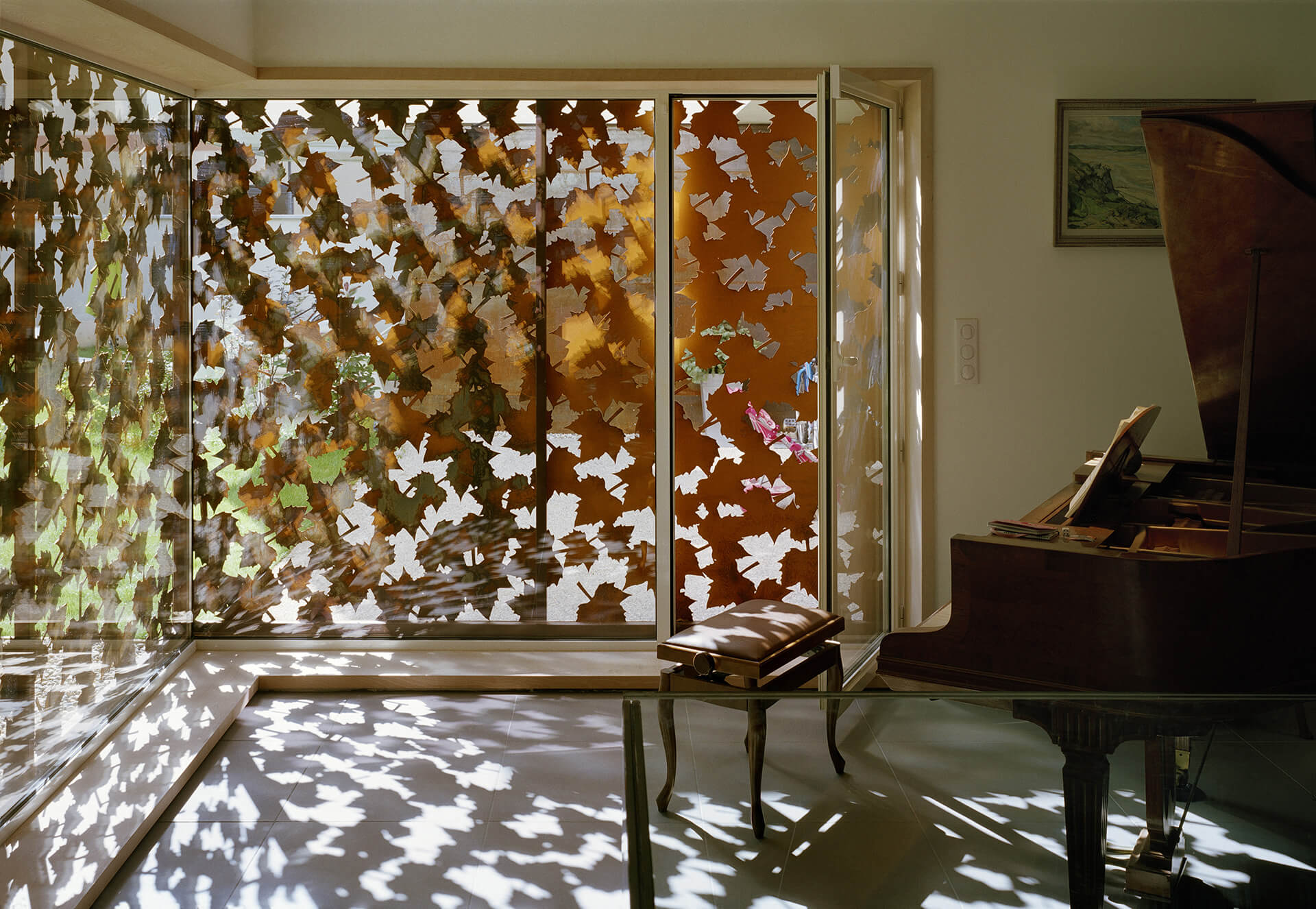 De vastes baies s’ouvrent sur le jardin. Elles sont occultables par d’élégants volets coulissants en métal découpé en forme de feuillage.