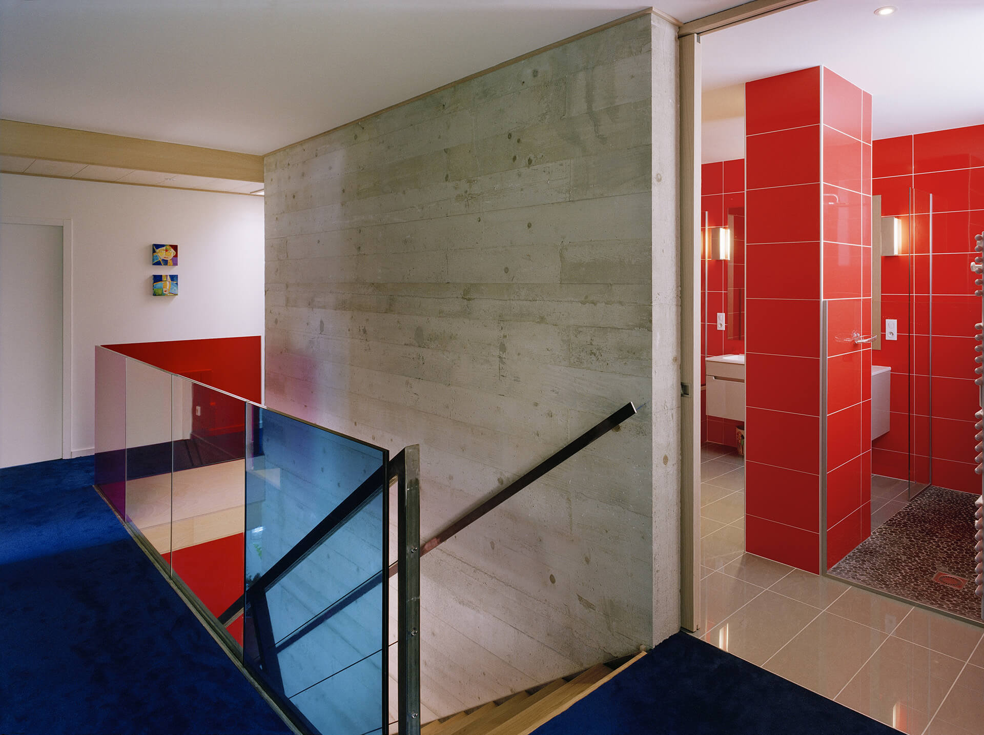En fonction des niveaux, d’autres ouvertures en bandes horizontales apportent de la lumière en façade sud, alors que la volumétrie en étage du bâtiment est utilisée pour positionner panneaux solaires pour l’eau chaude sanitaire (ECS) et panneaux photovoltaïques à l’endroit optimum identifié par l’Architecte en fonction d’une étude des ombres portées et de l’ensoleillement.