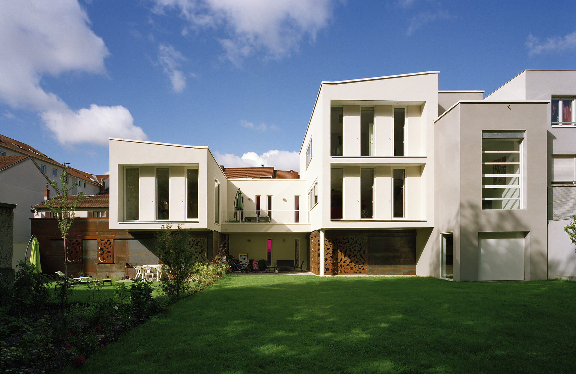 Cette vaste maison individuelle s’intègre dans un centre urbain dense, en cœur de ville.