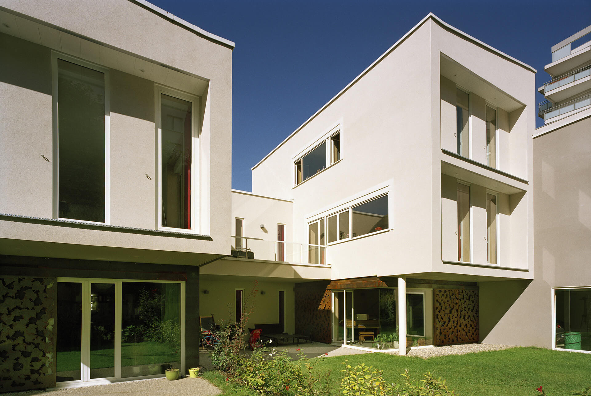 Se tournant vers le jardin, cette villa s’implante sur 3 niveaux + sous-sol, en imbriquant la résidence principale du client et une maison de ville locative indépendante.